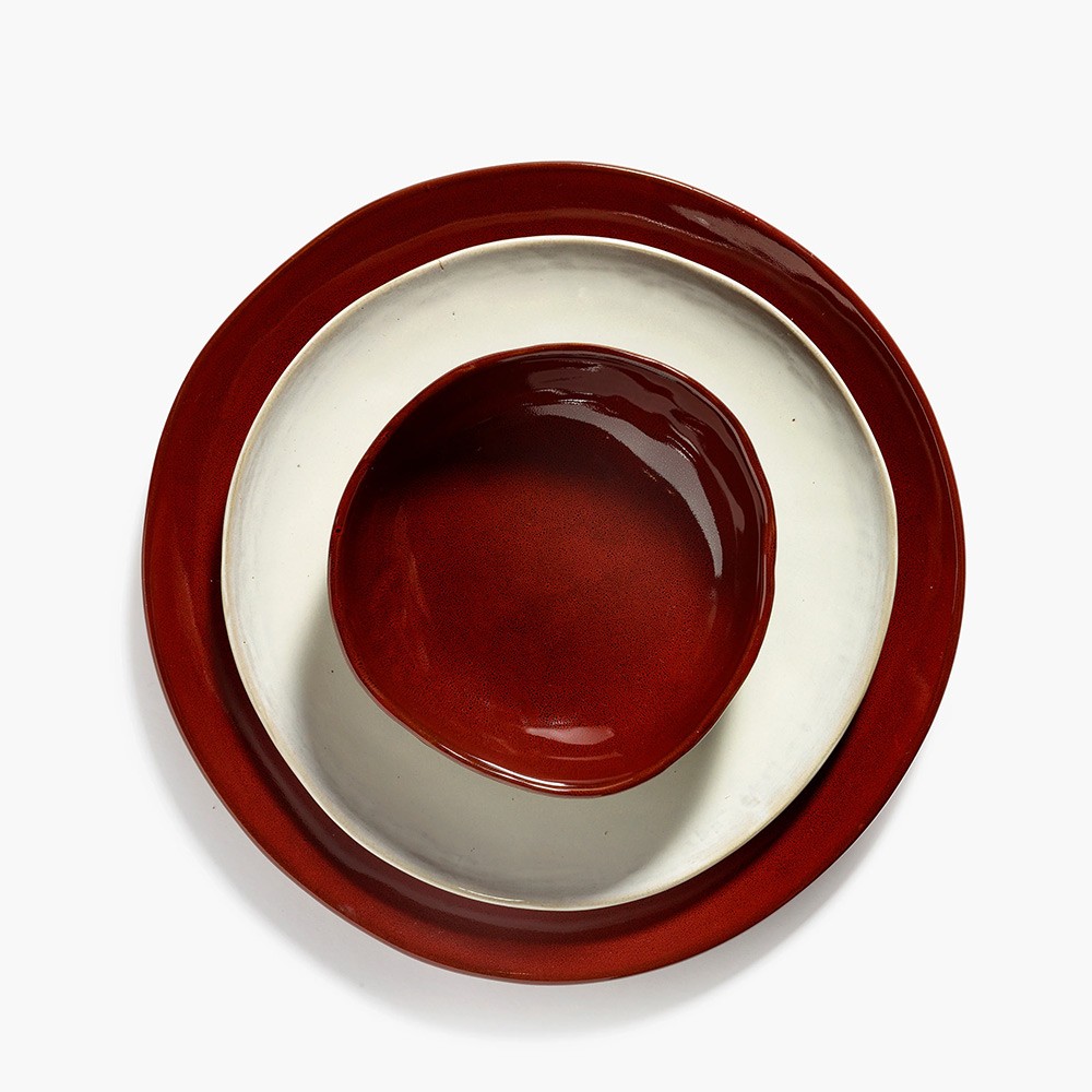 Optez pour les assiettes La Mère réalisées par Marie Michielssen pour Serax. La Mère, la première ligne de vaisselle en céramique de Marie Michielssen, est une ode amoureuse à la figure (grand-)mère et aux femmes en général. Chaque forme est unique et moulée à la main et toutes les pièces sont finies avec un émail blanc cassé ou un brun foncé chaud, presque noir. Comme troisième couleur contrastante, Marie a choisi un rouge vénitien audacieux.