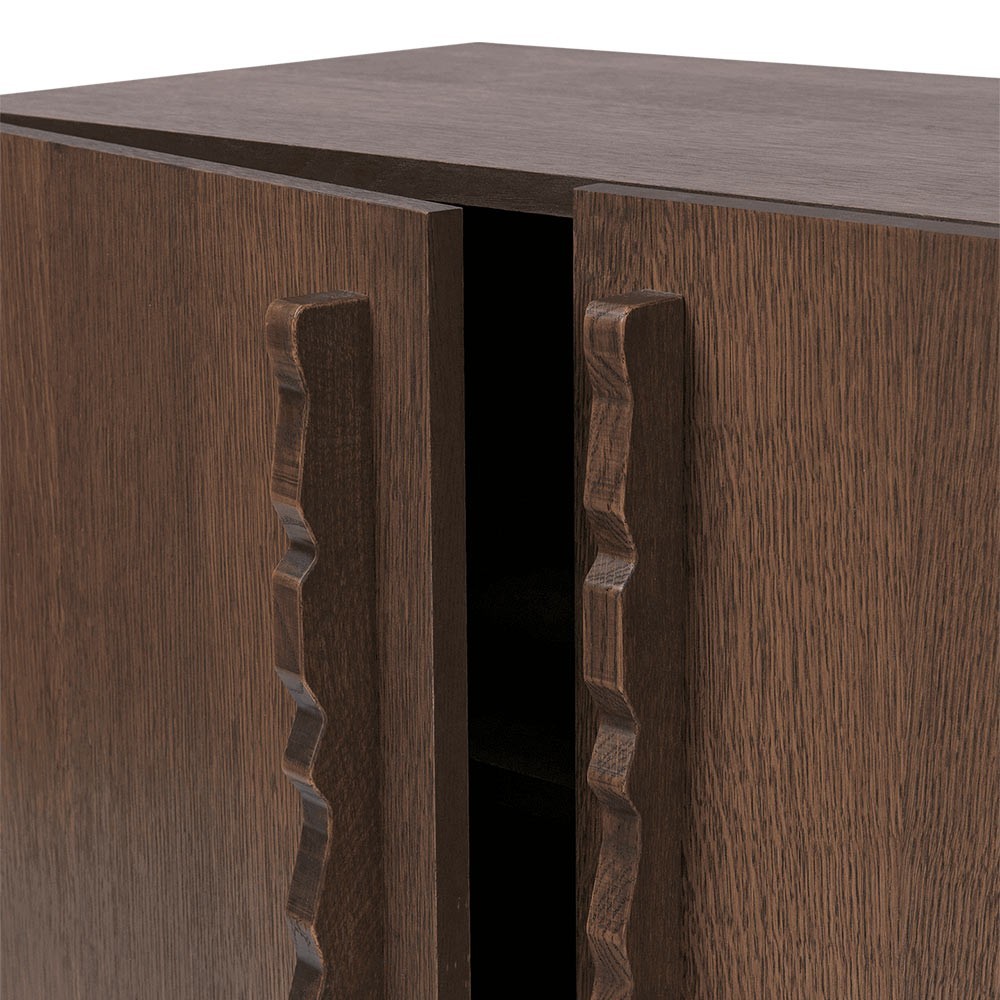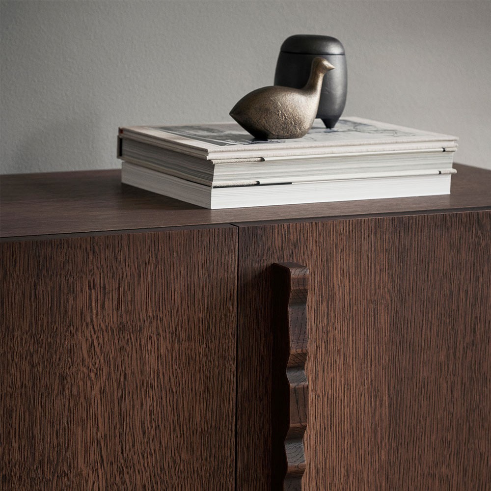 Le buffet Unda est fabriqué à partir d'un chêne certifié FSC™ teinté foncé, incarnant une esthétique robuste et classique qui contraste avec les poignées ondulées ludiques.