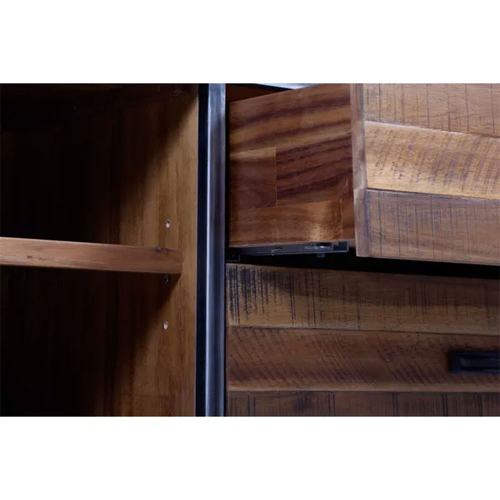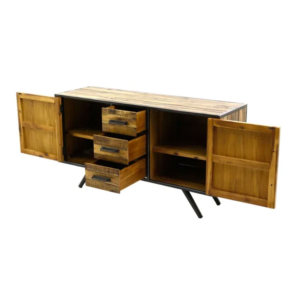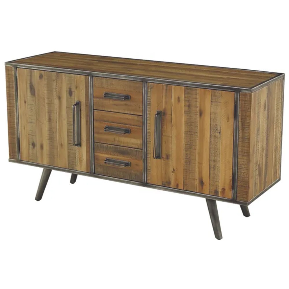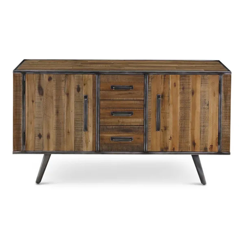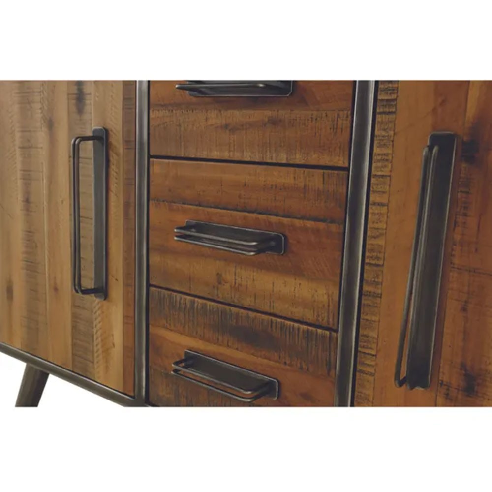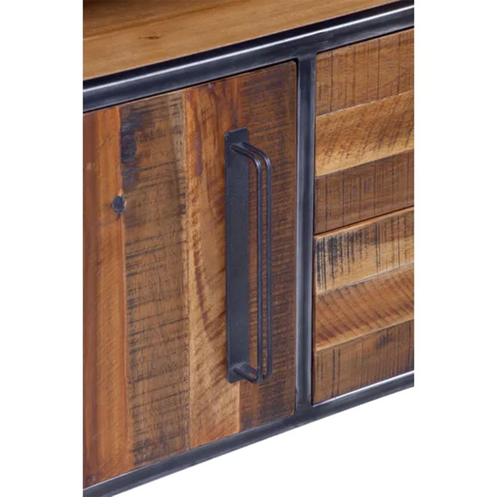 Le meuble bas Cuskao de la marque Pro Living, au style rustique et très tendance, allie charme authentique et praticité grâce à ses 3 tiroirs et 2 portes, offrant un espace de rangement idéal pour sublimer votre intérieur avec élégance et fonctionnalité.