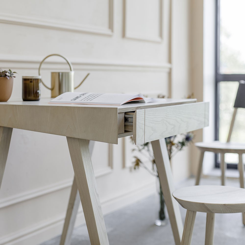 Le bureau 4.9 frêne lituanien S, au nom atypique, a été conçu par Marius Valaitis. Il est composé d'un caisson asymétrique à tiroirs et d'un espace de rangement à l'arrière. Elégant, il apporte non seulement confort et efficacité au travail, mais y ajoute aussi un peu de style.