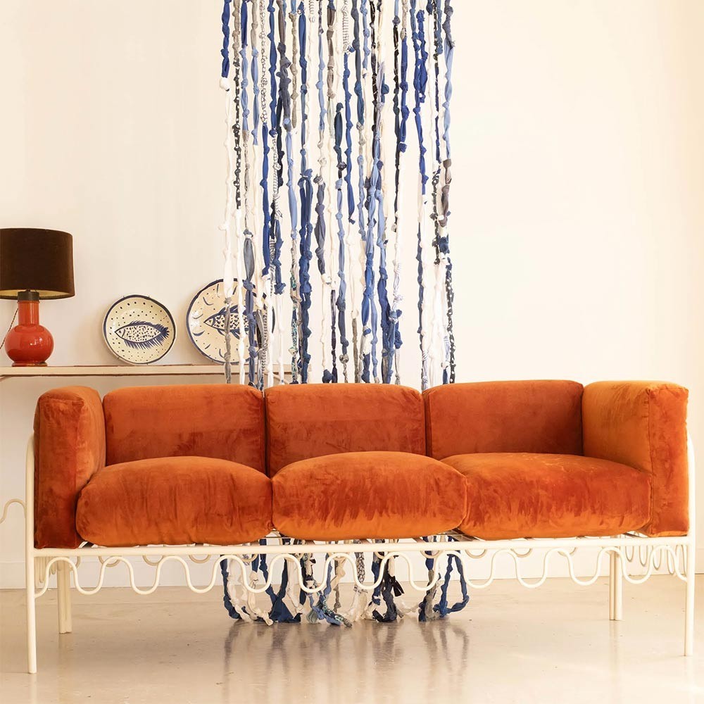 Le canapé Dolores est une extension de la gamme Dolores, reconnaissable à sa structure fer forgé en forme de vagues. Le Canapé Dolores en velours se décline en fer écru, une nouveauté 2023.