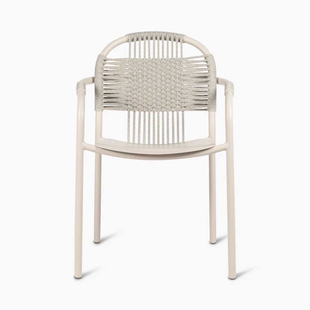Légère et empilable, la chaise Cleo est pensée pour l’extérieur. Son design épuré repose sur deux structures en aluminium : l’une dessine l’arche du dossier, l’autre enveloppe le dossier pour former les accoudoirs. Une corde tressée en polypropylène compose le dossier signature et se prolonge autour des accoudoirs pour offrir un confort accru.