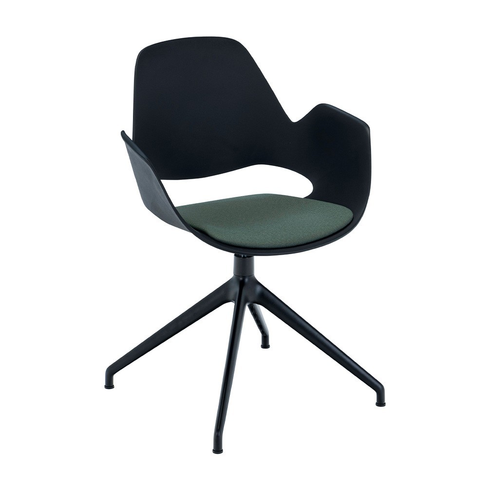 Cette jolie petite chaise rembourrée Falk, par Thomas Pedersen pour Houe, est un produit éco-responsable parfait pour votre intérieur ! En effet, cette assise est fabriquée à partir de plastique recyclé post-consommation directement tiré des déchets ménagers, et de tissu en polyester recyclé post-consommation, elle est d'ailleurs certifiée EU Ecolabel. Composée d'une base pivotante légère à quatre pieds, d'une assise en coque suivant les courbes de votre corps, et d'un siège rembourré vert foncé, cette chaise est à la fois moderne et originale. Idéale à la maison, dans votre salle à manger, ou au travail, dans votre bureau, la chaise Falk s'adaptera à l'utilisation que vous désirez.
