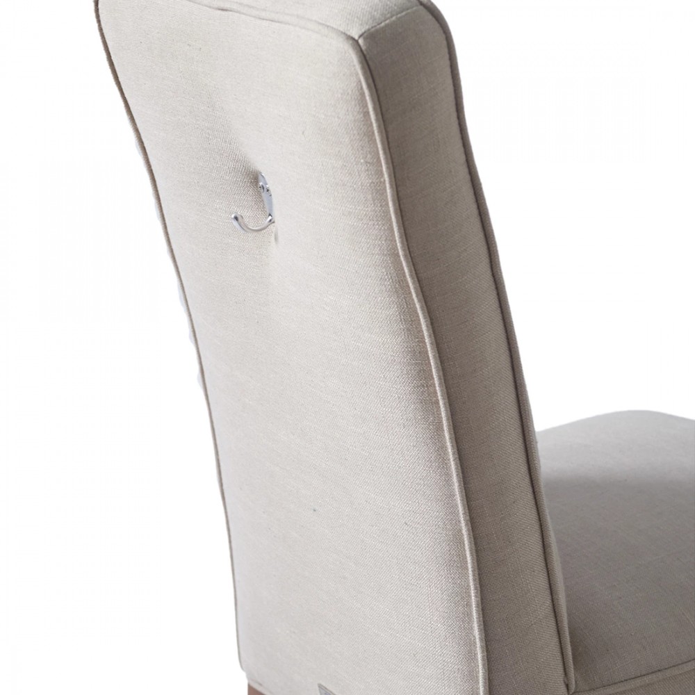 Chaises de salle à manger confortables, revêtues de lin. Le crochet au dos est pratique pour suspendre votre sac à main et ainsi éviter de le laisser traîner par terre. Également disponibles en plusieurs coloris et toile.