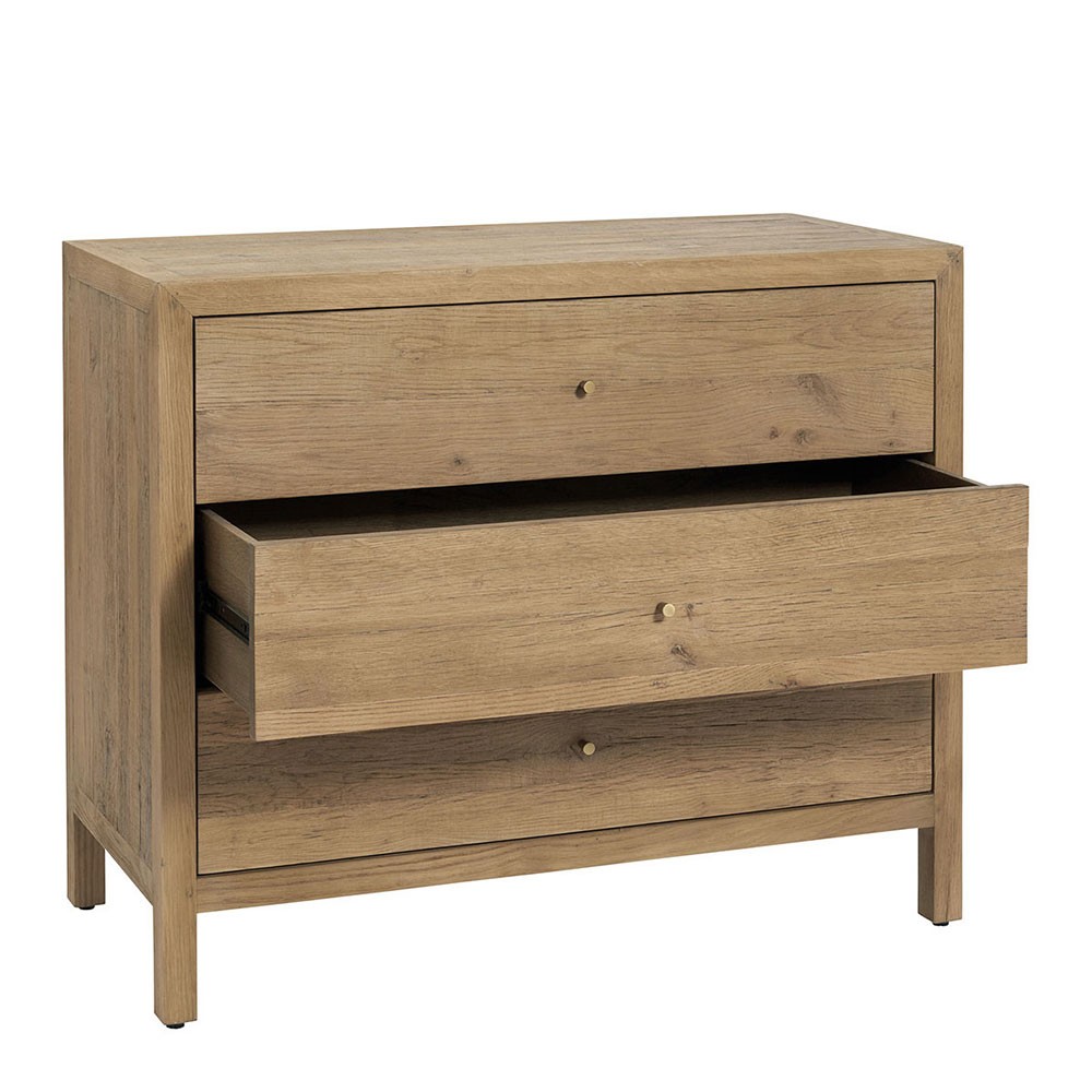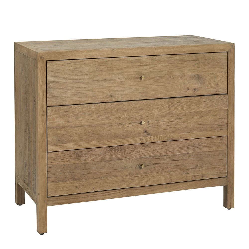 Inspirée du charme brut des établis de campagne, la commode MARCELLE vous séduira par son allure chic et authentique. Fabriquée à partir de chêne clair recyclé, elle apportera une touche chaleureuse et élégante à votre décoration. Son grain de bois naturel et sa construction robuste en font une pièce intemporelle, facile à adopter dans tous les styles d'intérieur. Grâce à ses trois tiroirs spacieux, vous disposerez d'un bel espace de rangement dans votre chambre ou votre salon.