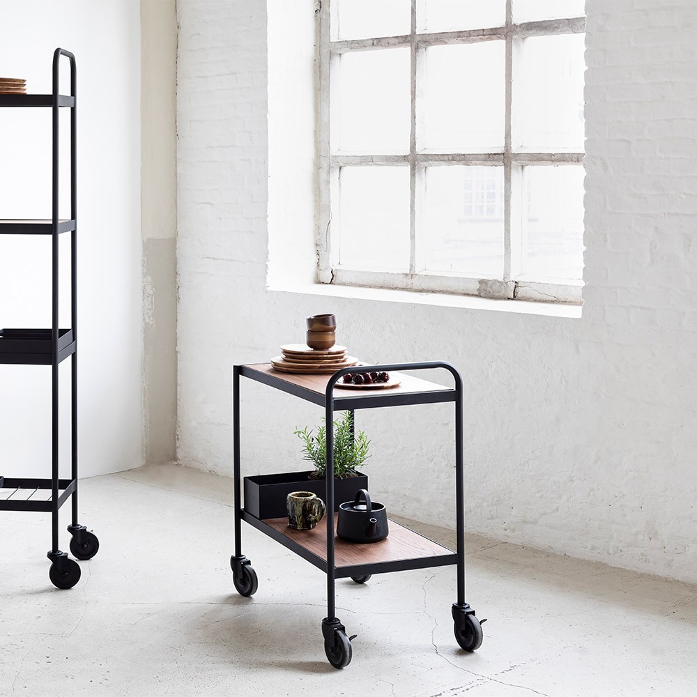 Besoin d'un peu plus d'espace dans votre cuisine ou salle à manger ? Pourquoi ne pas craquer pour la desserte James noir, designée par Marie Michielssen. Un gain de surfaces pour ranger votre service à vaisselle, vos accessoires de cuisine, ou bien d'autres. Son design en métal noir et bois chaud en fait une pièce qui apportera chaleur et caractère à votre salle à manger ou cuisine.