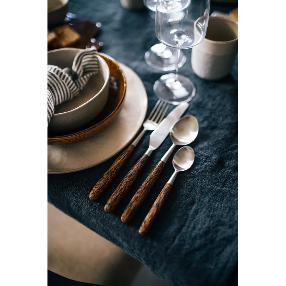 Conçus en acier inoxydable, les fourchettes, couteaux et cuillères de cet ensemble sont rehaussés d'un manche en bois de palmier. Pour cette raison, nous vous conseillons de les laver à la main, afin de prolonger leur éclat.