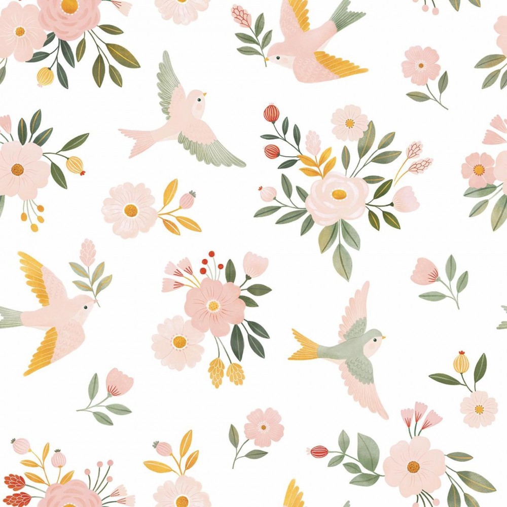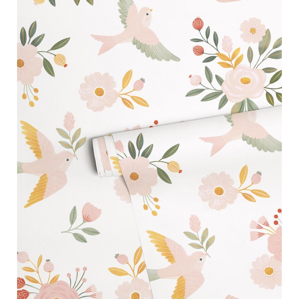 Papier peint fleurs et oiseaux (fond blanc) - ALYSSE par Lilipinso