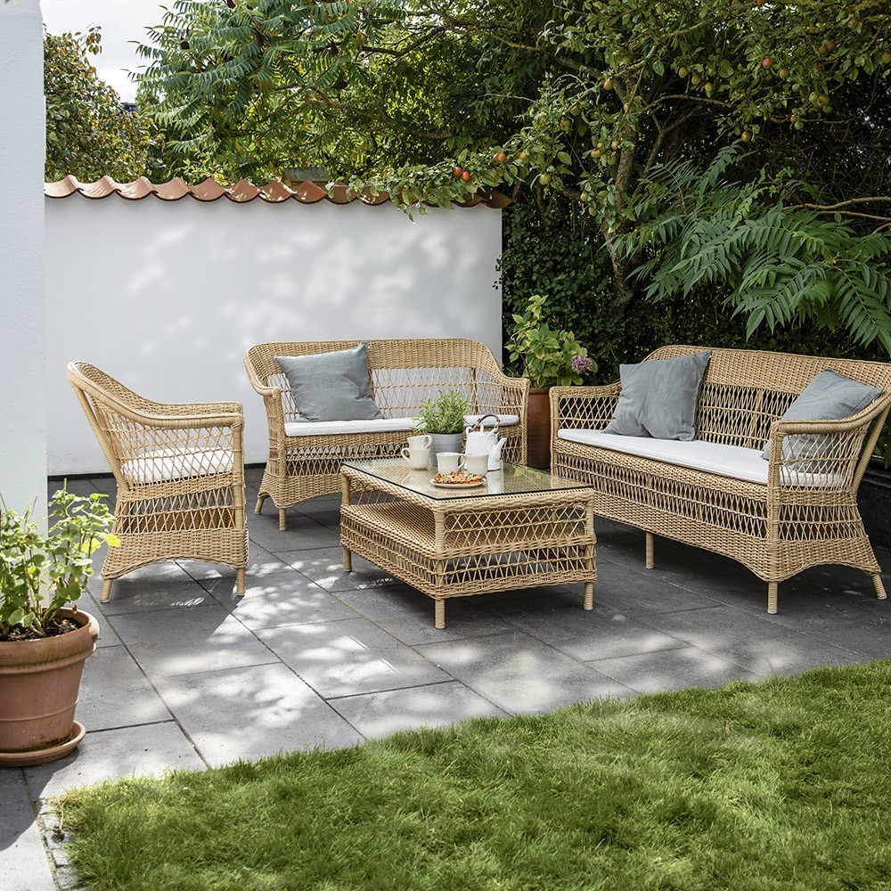 Collection de fauteuils, canapés et tables basses Charlot de Sika-design en rotin naturel et taupe pour l'extérieur. Créez une ambiance cosy et chaleureuse avec cette jolie collection de mobilier pour un usage extérieur. Tous les produits de la collection sont confectionnés avec une structure aluminium et fibre synthétique taupe ou naturel (polyéthylène).