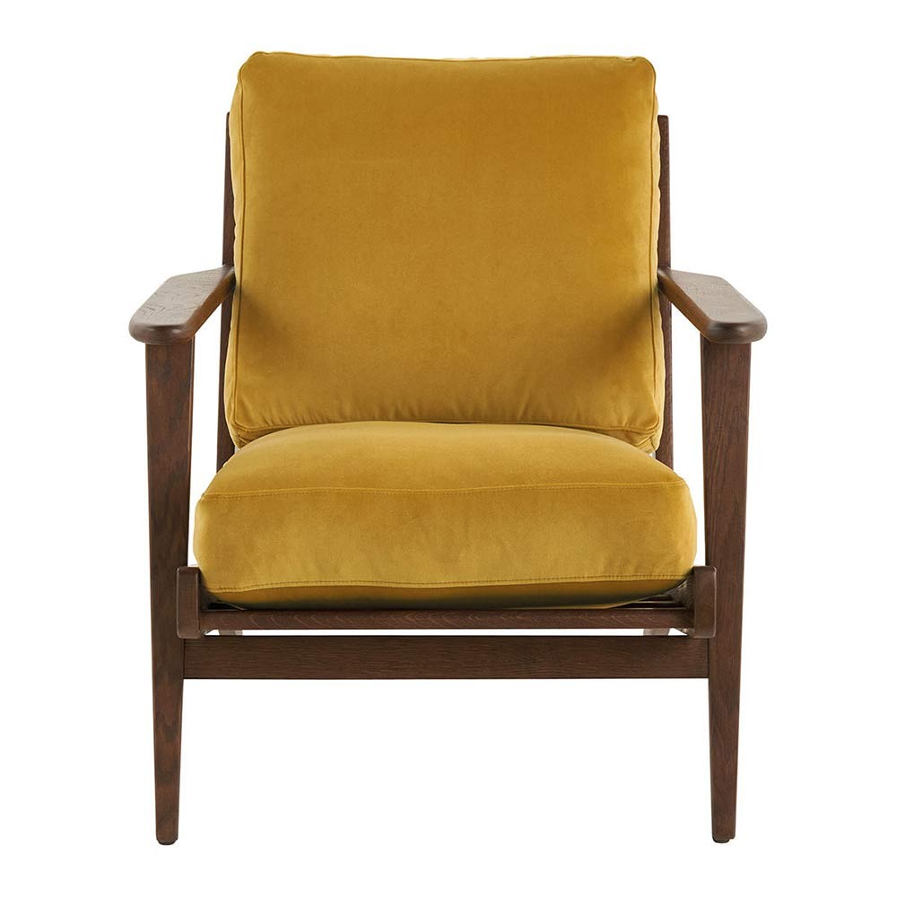 Laissez-vous séduire par le design chic et intemporel du fauteuil JULES. Le mariage du bois foncé et du tissu velours safran apportera une touche d'élégance et de raffinement à votre décoration intérieure.