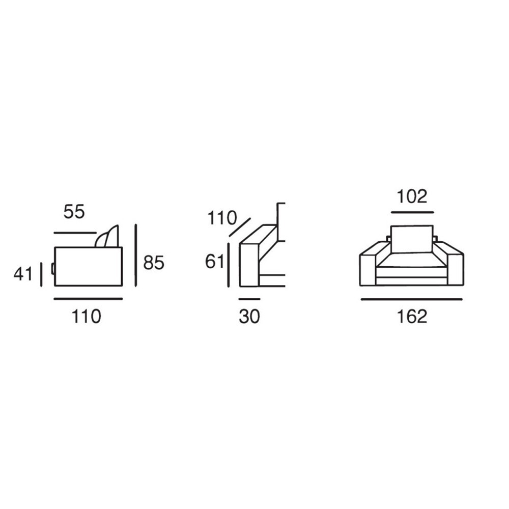 - Largeur : 162 cm | Profondeur : 110 cm | Hauteur : 85 cm | Profondeur d’assise : 55 cm | Hauteur d’assise : 41 cm
