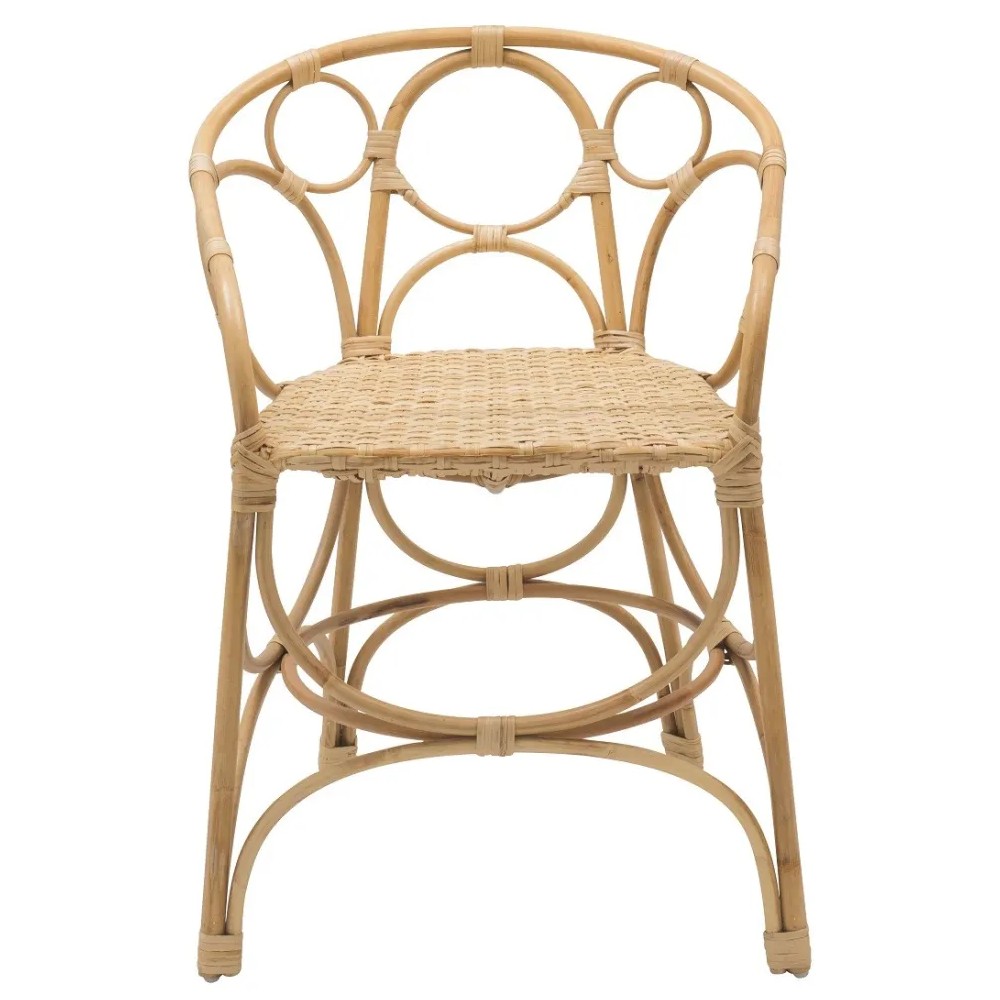 La structure est réalisée en canne de rotin écorcée, tandis que les ligatures et l’assise sont tressées en éclisse de rotin. Le tout est protégé par une finition vernie à l’eau au rendu naturel. Chaque pied est équipé d’un patin en nylon pour protéger les sols et faciliter les déplacements.