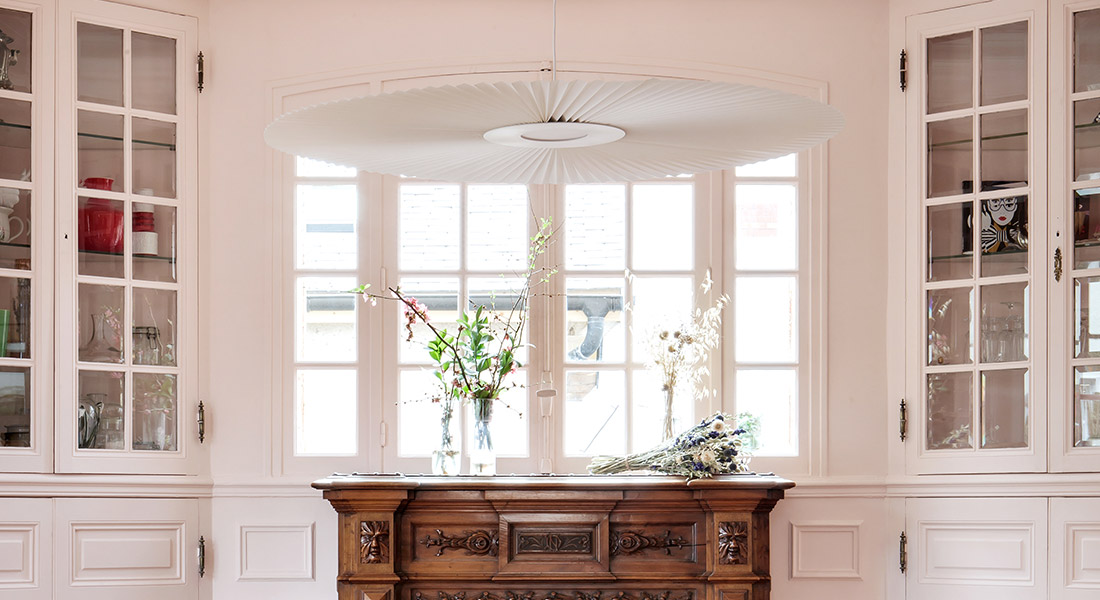 On se surprend alors à l’admirer pendant de longues minutes tout en essayant de percer le secret de sa structure en tissu plissé. À la fois imposante et aérienne, mystérieuse et poétique, la jupe de cette danseuse se déploie et vient rythmer un espace par ses lignes répétitives. Hartô se retrouve dans cette démarche et ce visuel, l’alliance est parfaite ! La suspension Carmen se décline en blanc, gris ardoise et nude pour 2 diamètres différents (128 cm ou 90 cm) afin qu’on puisse adapter parfaitement cette grande dame à tous types de pièces.