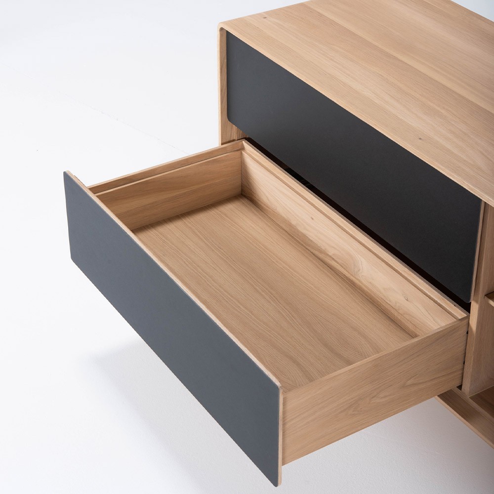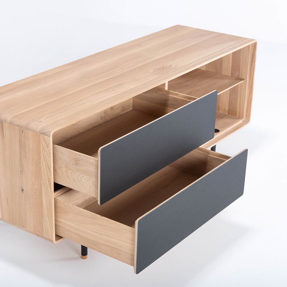 La gamme de meuble de rangement Fina par Gazzda n'a pas fini de vous surprendre ! Le meuble TV 150 Fina va vous ravir par son côté minimaliste et chaleureux. Son coloris chêne & noir apportera chaleur et authenticité à votre salon. Aussi pratique qu'esthétique, son encoche vous permettra de dissimuler vos câbles pour connecter vos appareils électroniques. De plus, ses deux grands tiroirs vous offrent un grand espace de rangement, idéal pour y ranger télécommandes, câbles, consoles et jeux vidéo,... Existe aussi en version chêne & crème.