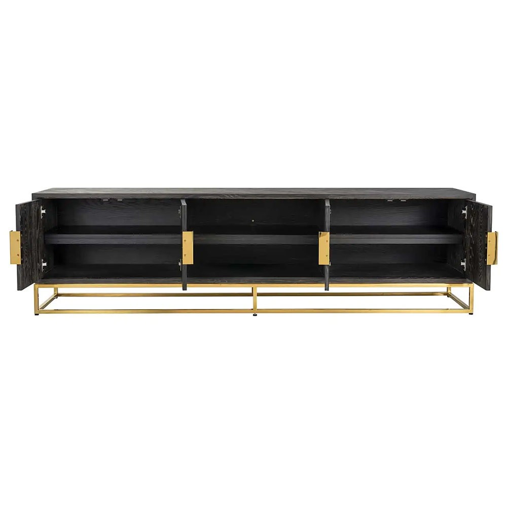 Le meuble TV BlackBone, fabriqué en plaqué chêne et acier inoxydable, se distingue par son coloris noir et or raffiné, apportant une touche d'élégance moderne et un style intemporel à votre espace de vie.