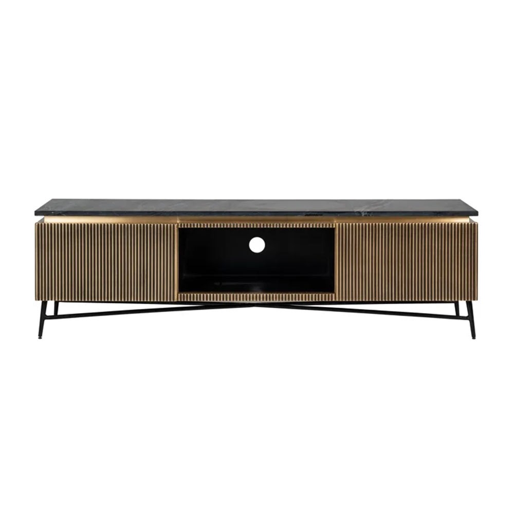 Ce meuble TV Ironville, avec son plateau en marbre, revendique un style déco moderne et élégant. Sa structure en bois et son plateau en marbre lui confèrent à la fois robustesse et longévité