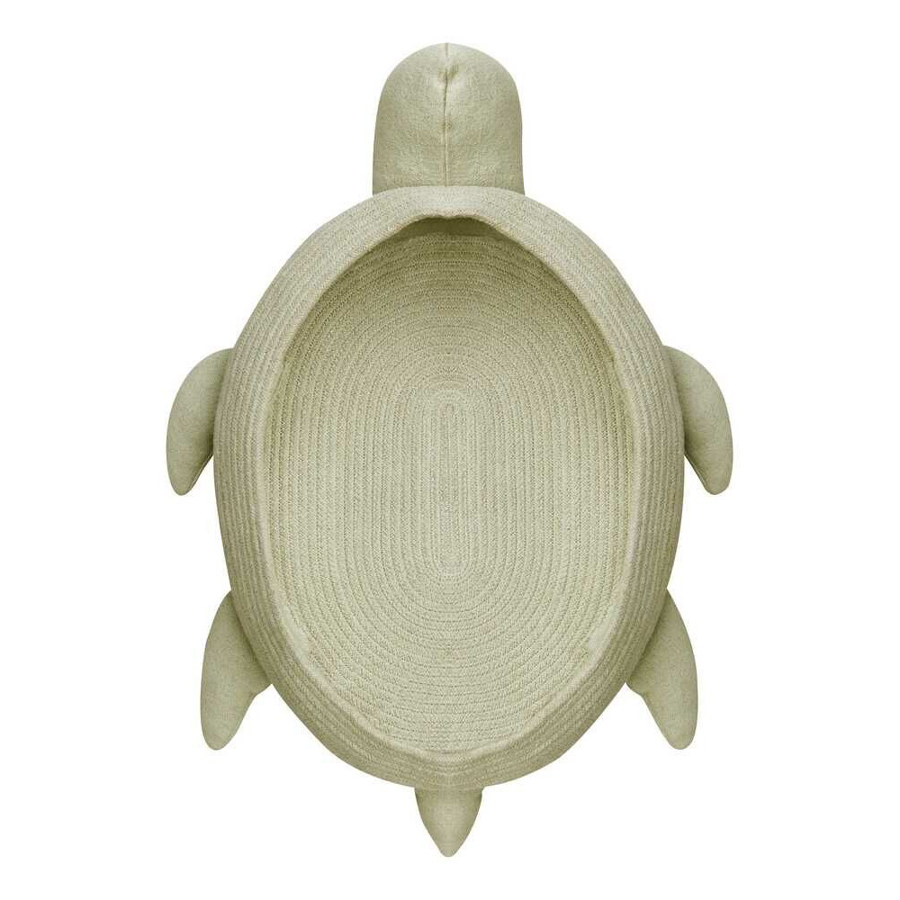 En forme de tortue de mer, le panier Maman Tortue est fabriqué à la main à l'aide de cordons tressés faits de fibres provenant de bouteilles en PET recyclées. La partie inférieure du panier, représentant le corps de la tortue, est réalisée en cordelette vert olive, avec des pieds bouffants et une tête façonnée en toile de coton olive attachée.
