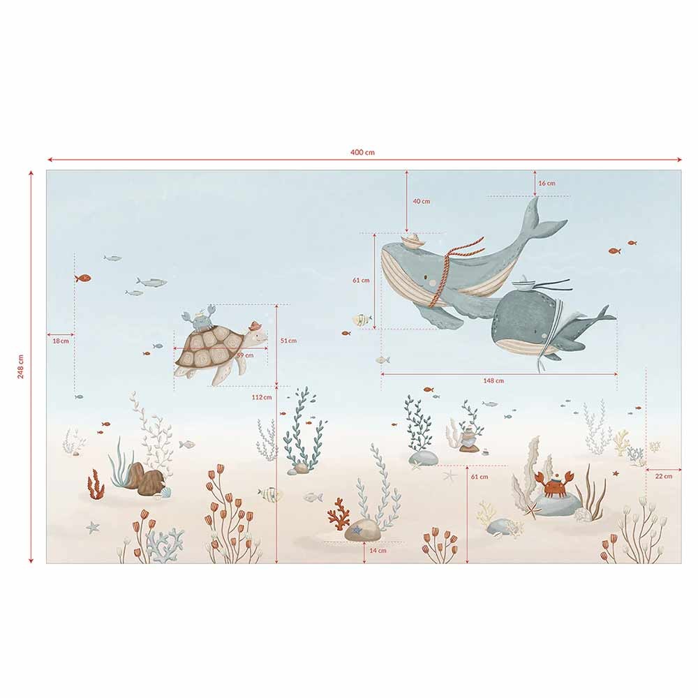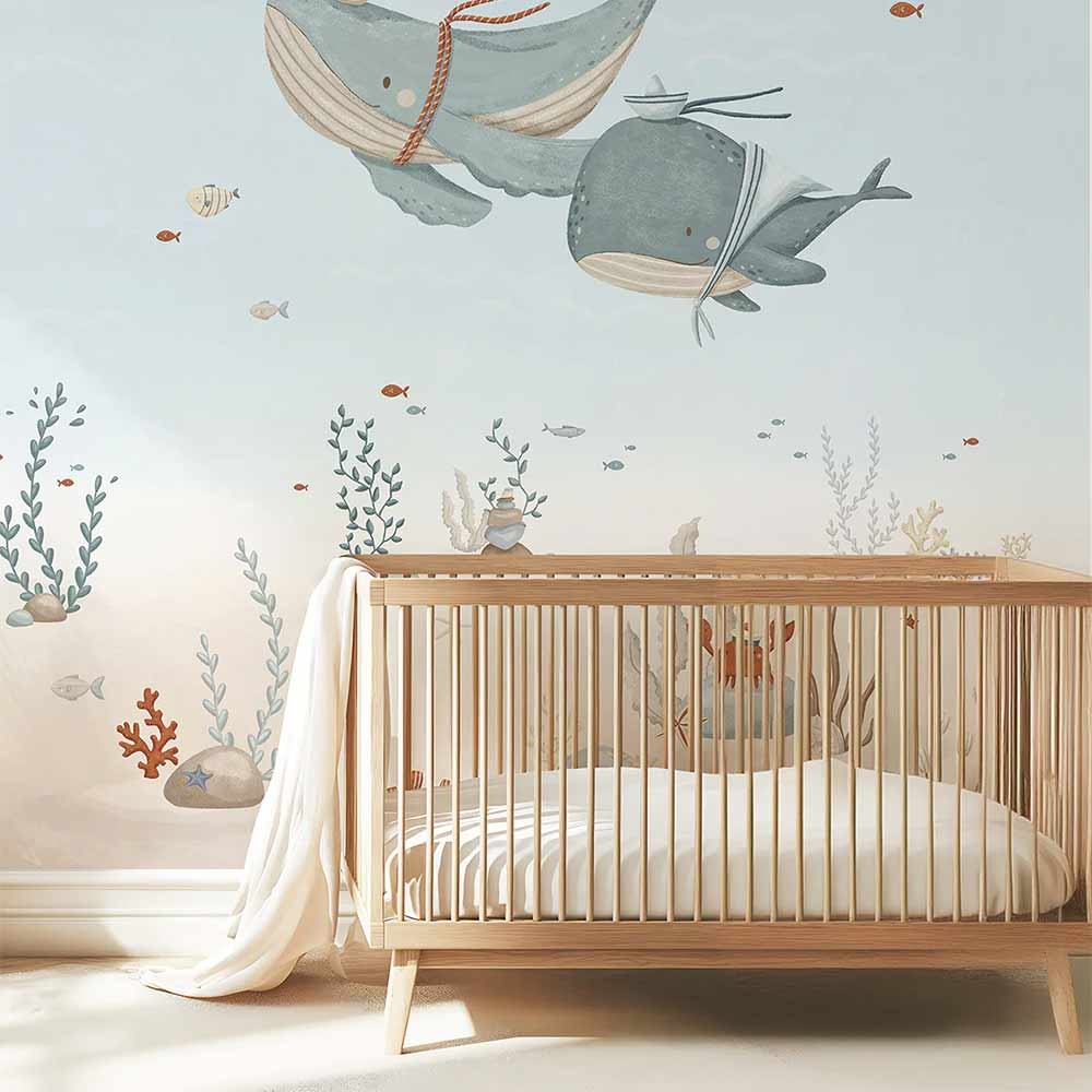 Découvrez le papier peint panoramique« Les Baleines », qui transforme la chambre de votre enfant en un sanctuaire marin enchanteur. Avec ses illustrations de baleines, tortues et poissons, ce décor captivant en teintes bleues et blanches crée une ambiance magique et apaisante, idéale pour éveiller l’imagination et la curiosité.
