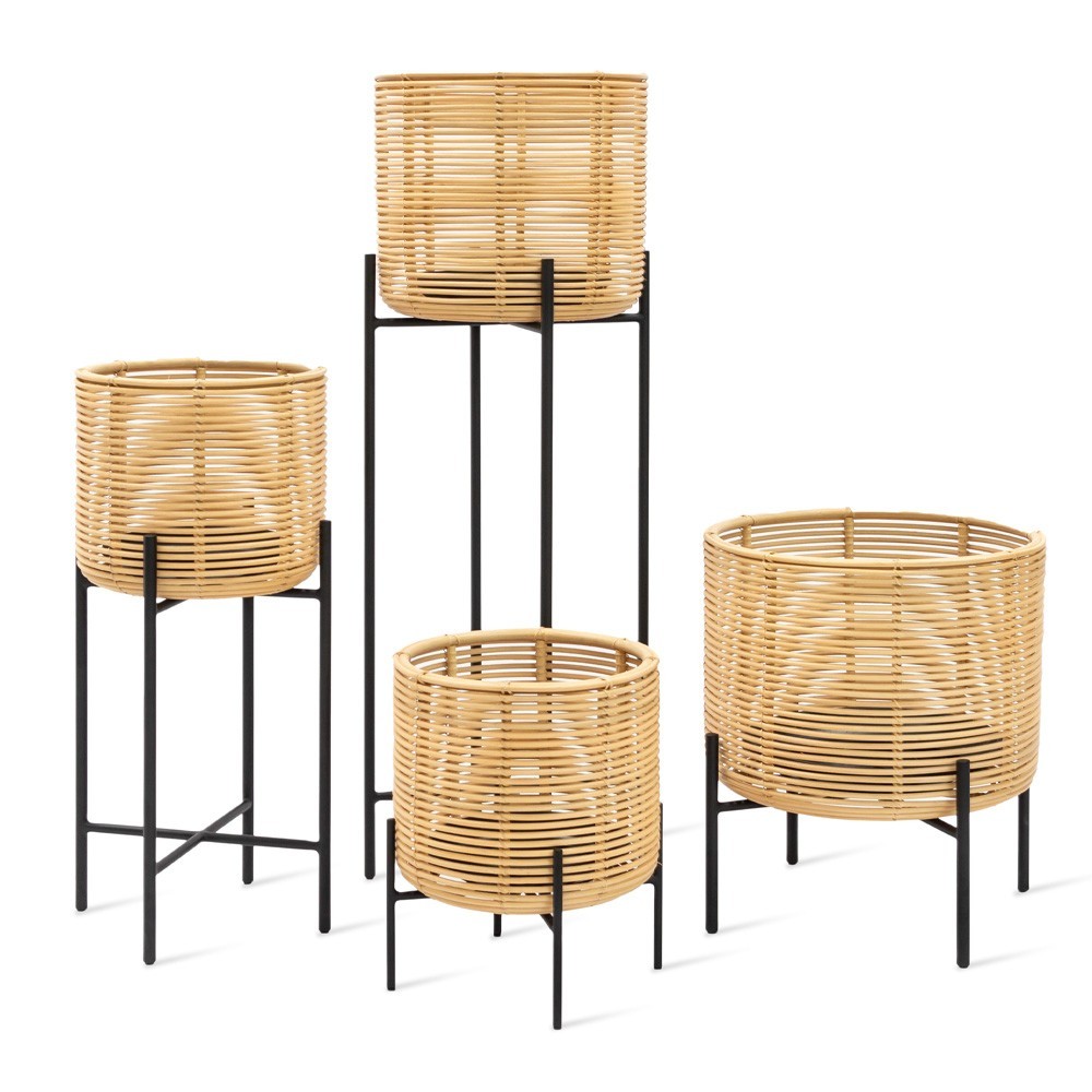 - Corbeille à plantes en rotin naturel sur piètement en acier thermolaqué noir | Soucoupe en plastique incluse