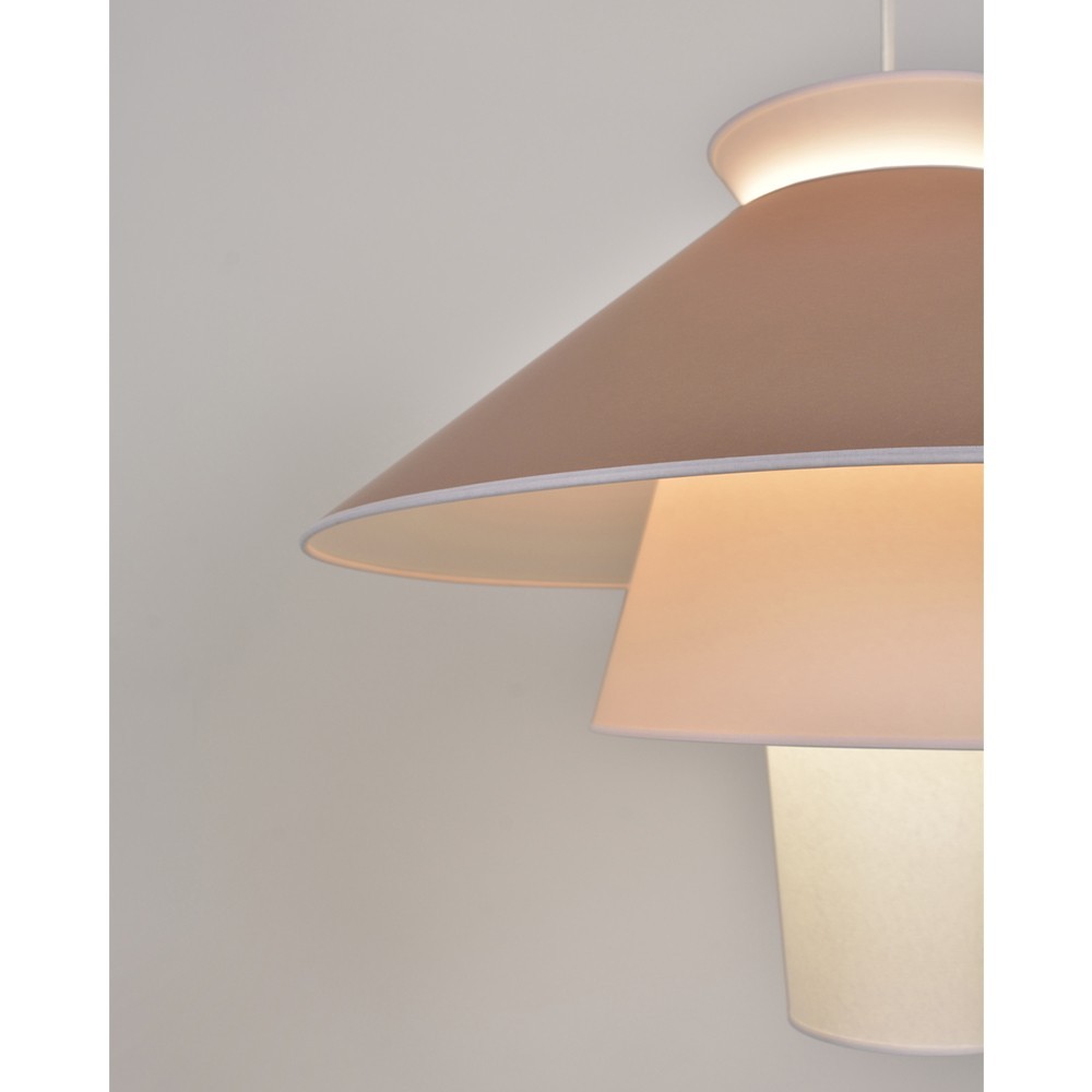 Dans un style design aux influences scandinaves, cette accumulation d’abat-jour évoque la forme d’une ruche stylisée. Les cônes jouent avec la lumière, la diffusant ou la reflétant sur la surface lisse et douce de ses matières.