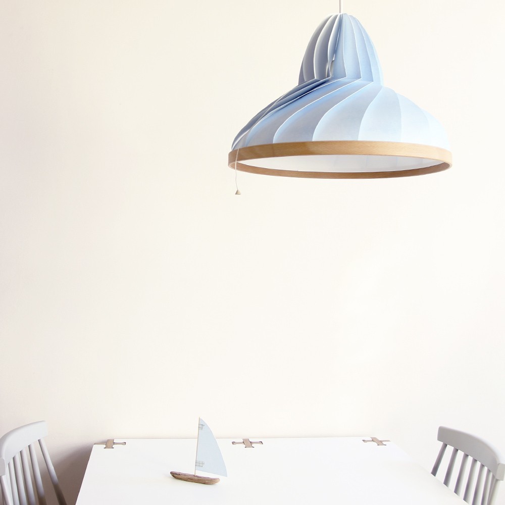 Nellianna et Kenneth ont été inspirés de leurs promenades sur la plage pour concevoir la suspension Wave bleu pastel en forme de vague. Cette magnifique collection de suspensions fabriquées à la main dans le studio de la marque Snowpuppe basé à La Haye revisite la tradition de l'origami dans un style très contemporain.