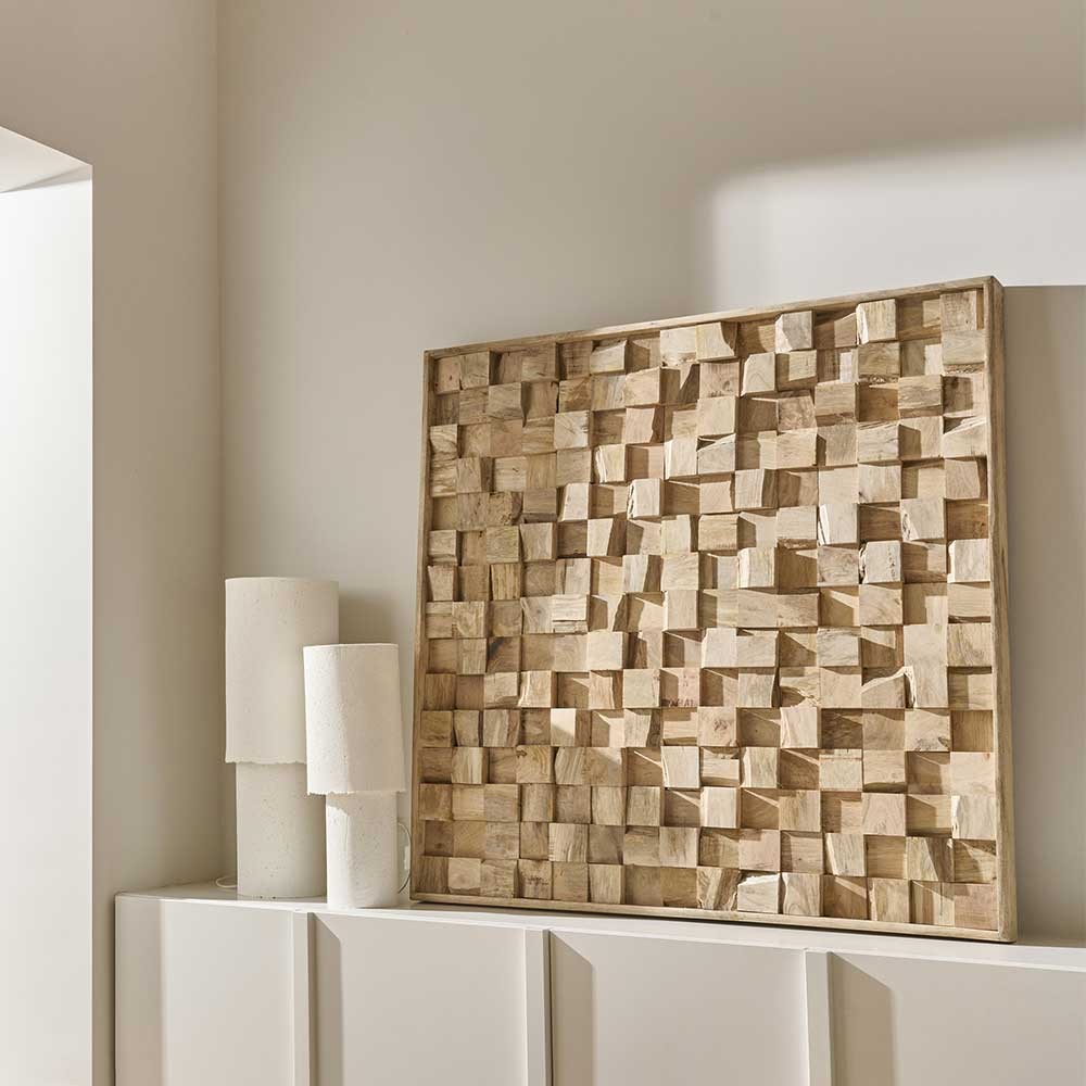 Mangga est une décoration murale remarquable qui apporte relief et caractère à votre intérieur. Composée de cubes en bois de manguier récupéré, méticuleusement sélectionnés et agencés dans un cadre en bois raffiné, cette œuvre artistique interagit avec la lumière pour créer de délicats jeux d’ombre. Disponible en trois tailles, Mangga s’adapte harmonieusement à tout type d’espace. Mangga est disponible en 3 tailles.