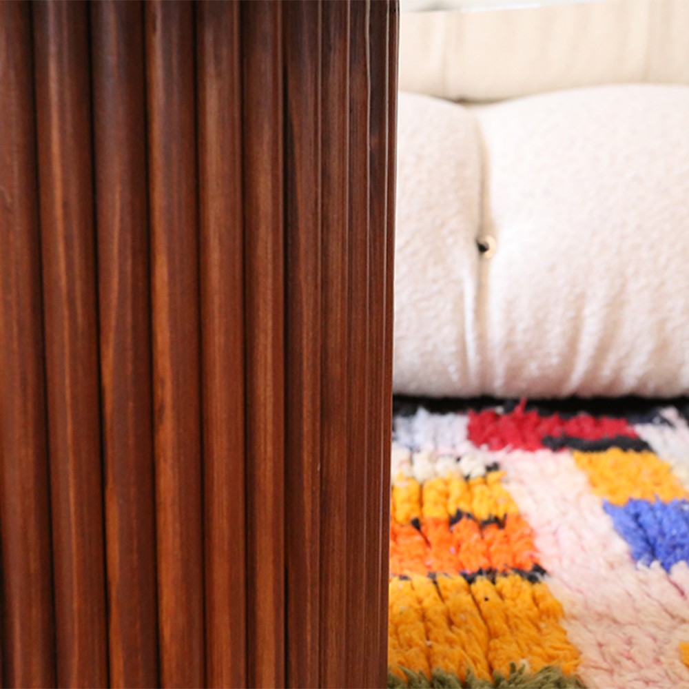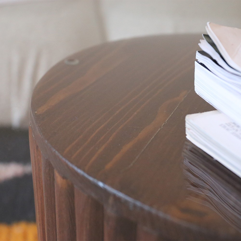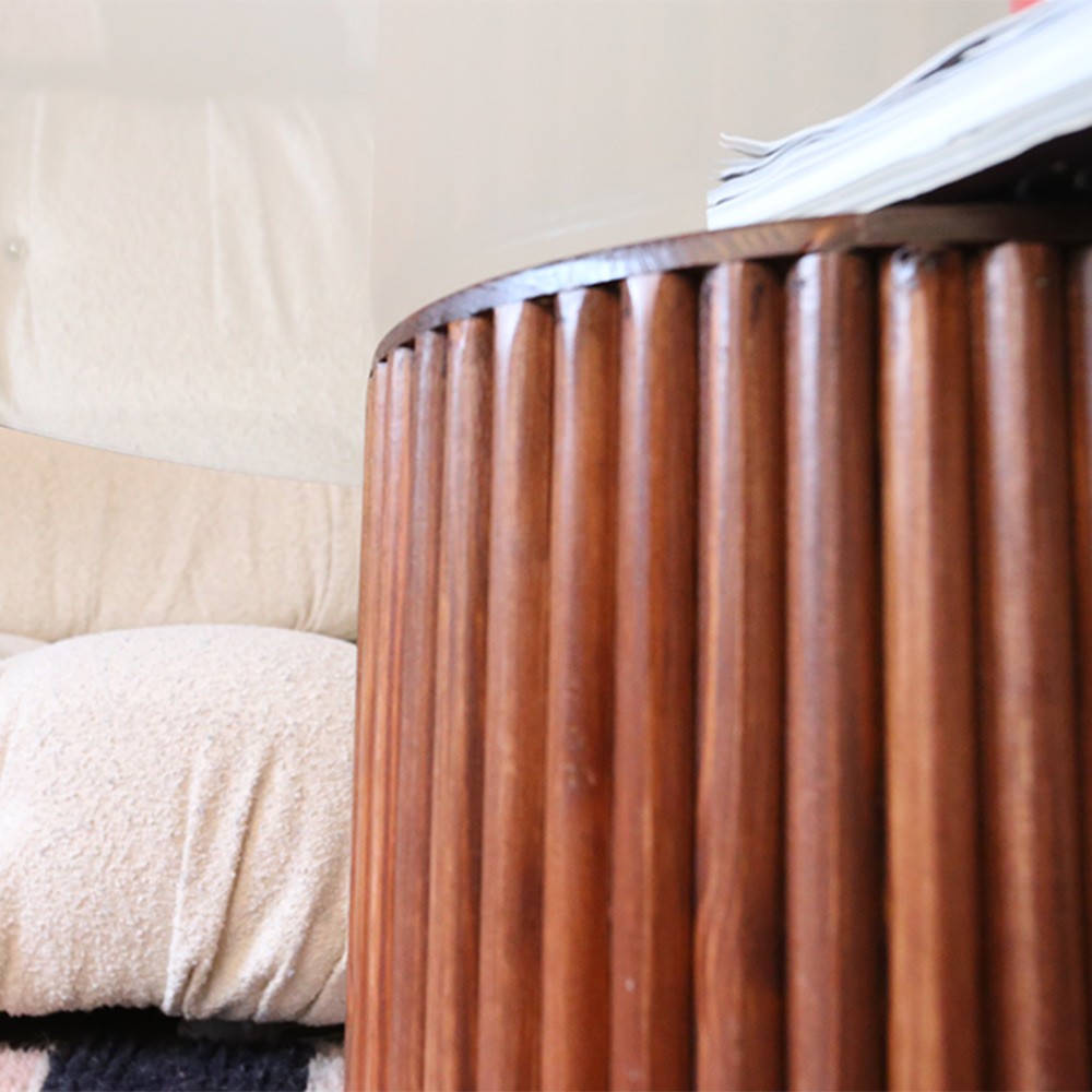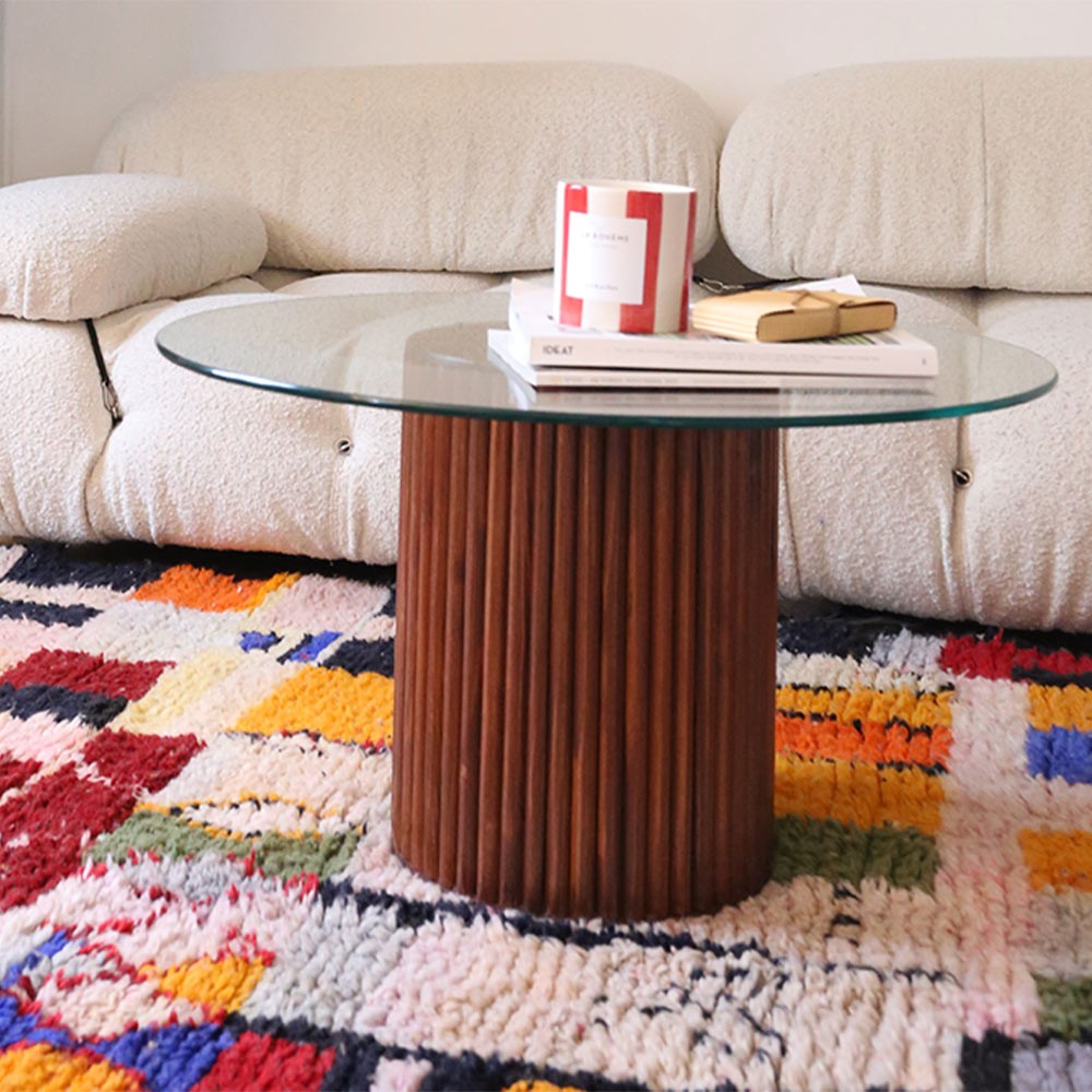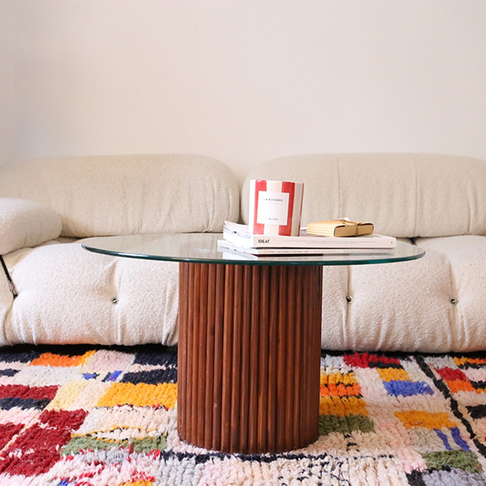 Découvrez la table basse de Them en verre et bois de sapin rouge designée par Marion la fondatrice de THEM et confectionnée de façon 100% artisanale au Maroc.