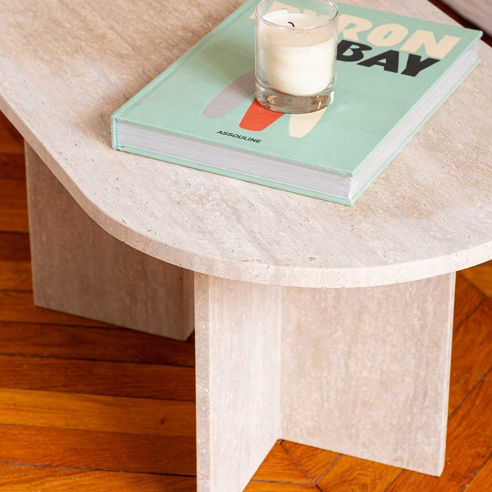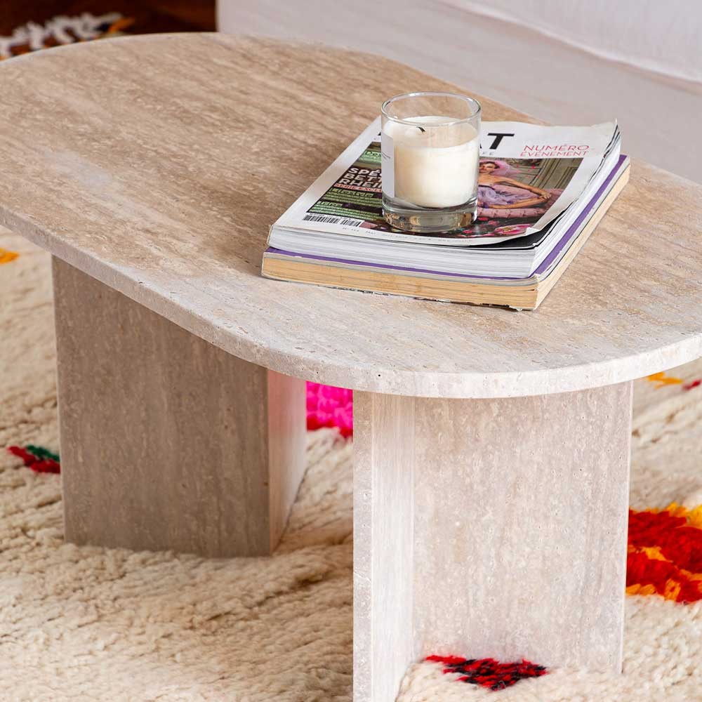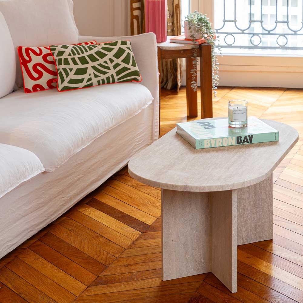 Table basse en travertin designée par Marion la fondatrice de Them et confectionnée de façon 100% artisanale au Maroc dans l’un de nos talentueux ateliers partenaires.