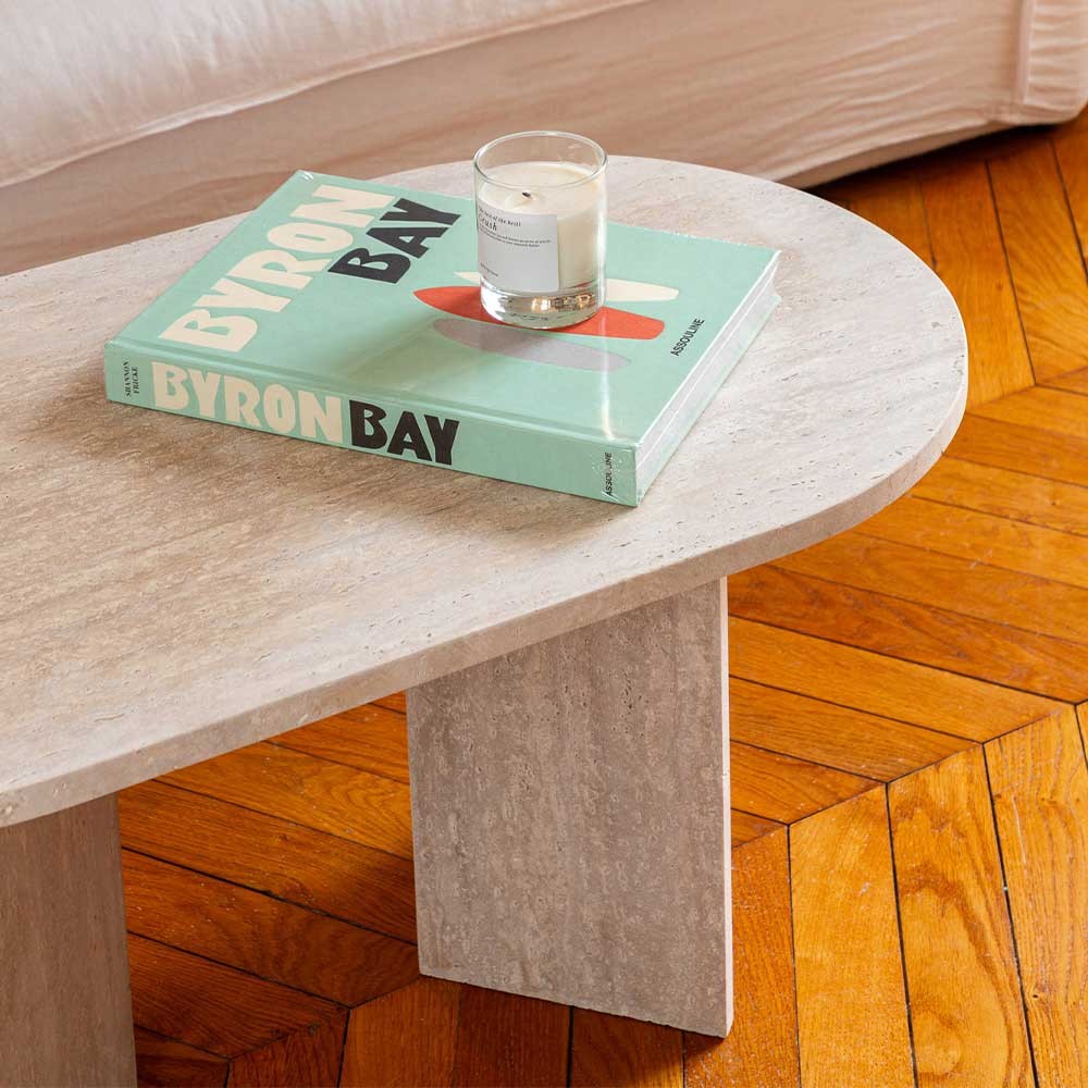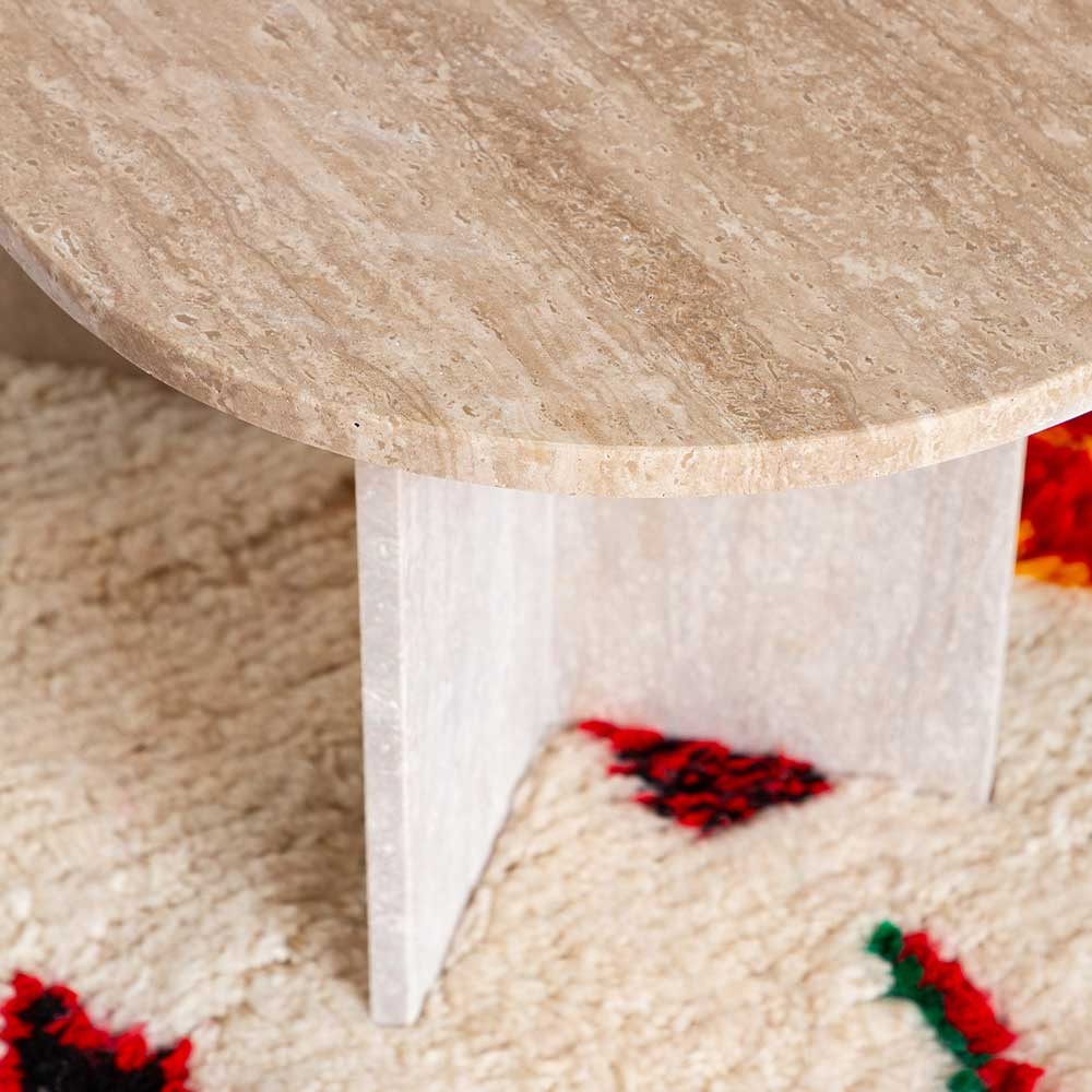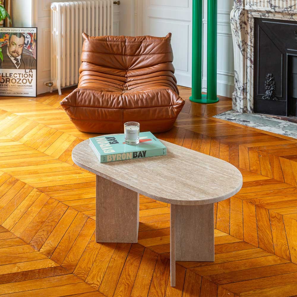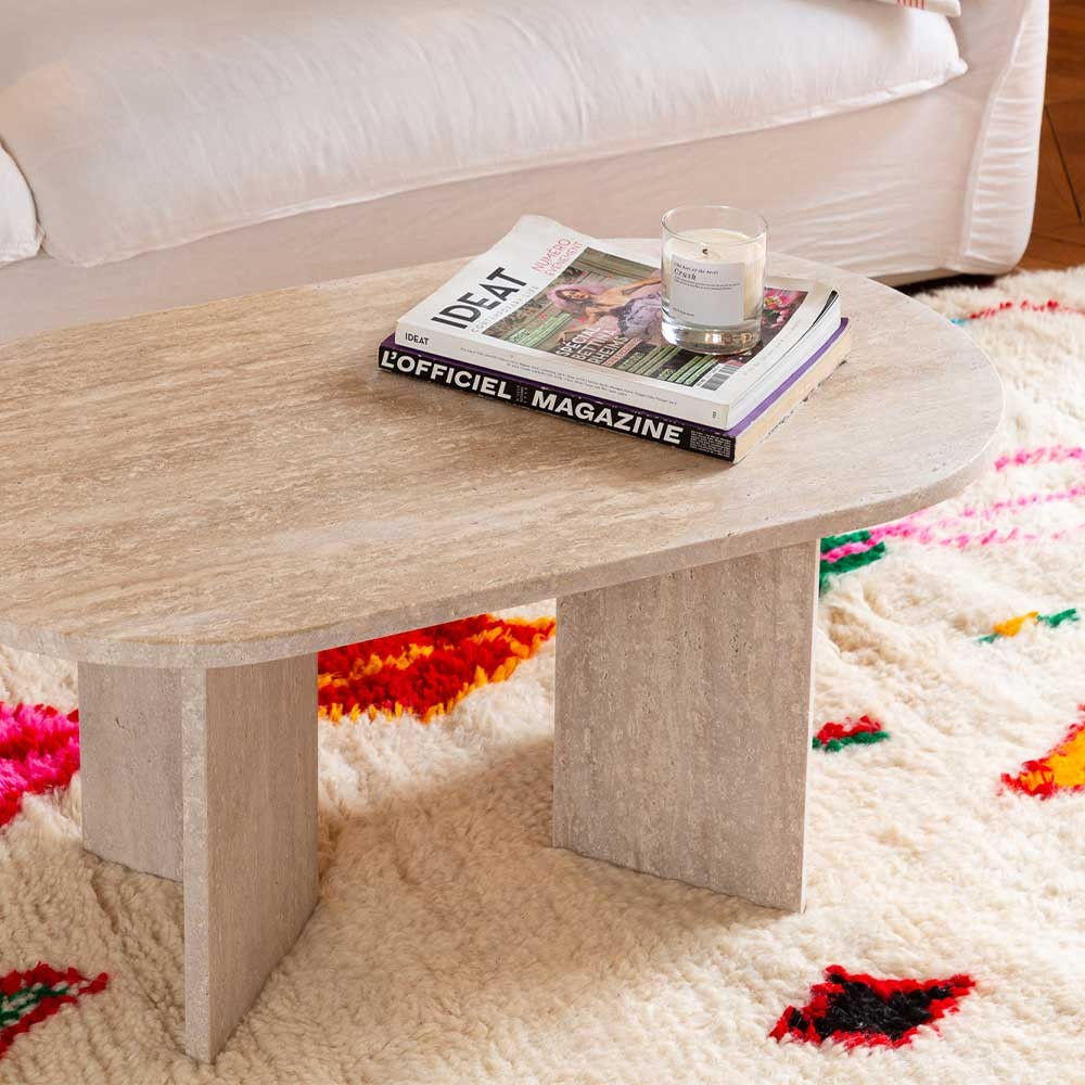 Table basse en travertin designée par Marion la fondatrice de Them et confectionnée de façon 100% artisanale au Maroc dans l’un de nos talentueux ateliers partenaires.