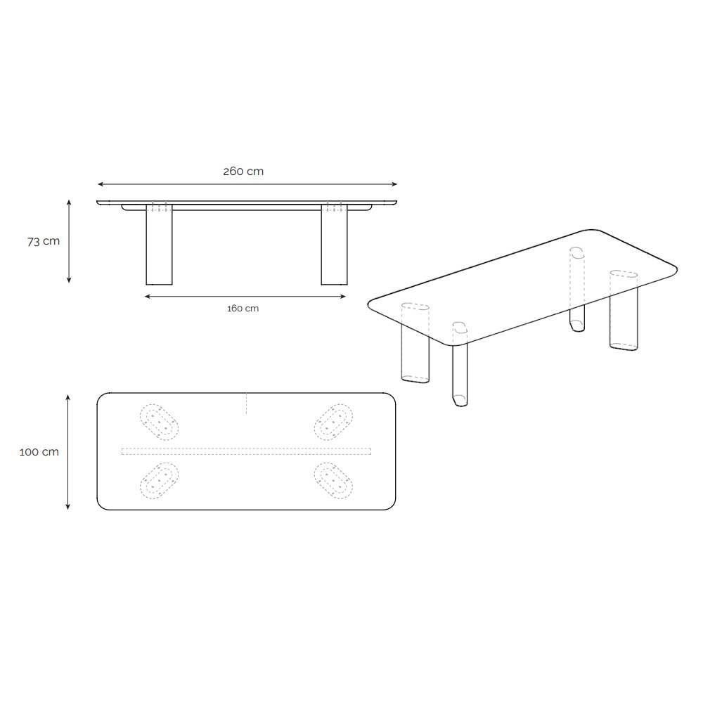 - 260x100 cm : 8 à 10 couvertsl Hauteur : 73cm l Épaisseur du plateau : 3 cm