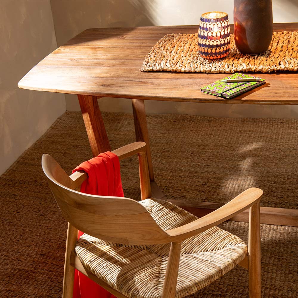 La table à manger Maty, en bois exotique et rotin, séduit par son allure raffinée et son piétement unique. À la fois robuste et élégante, elle incarne le parfait équilibre entre style naturel et design.