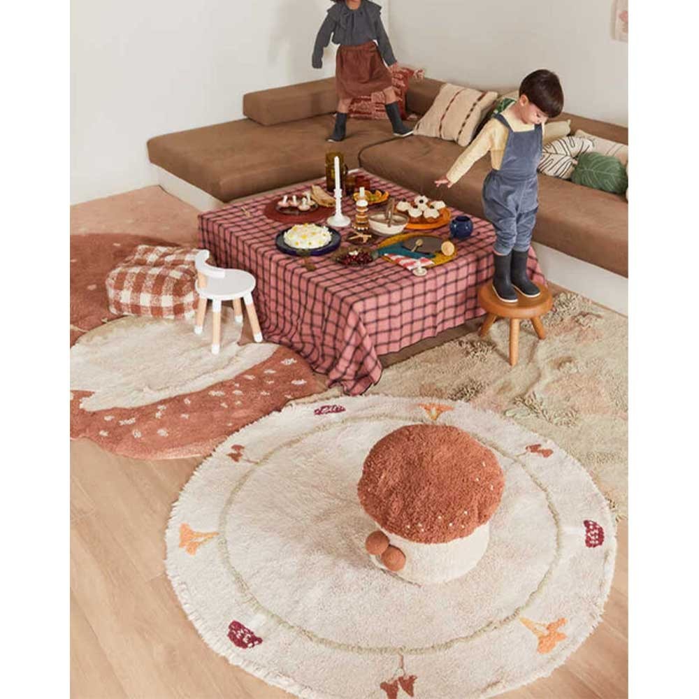 Un tapis en coton doux, formé de deux charmants champignons - un grand, un petit. Il est tissé avec le coton naturel le plus doux dans des tons Chestnut et Olive. Des rangées de touffes légèrement plus longues et des tresses ajoutées en bas ajoutent un charme supplémentaire à ce ravissant tapis.