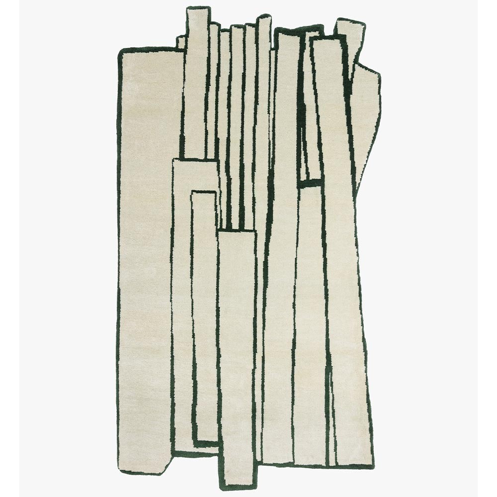 Composée d'une composition dynamique de formes rectangulaires superposées, CONTOUR est conçue sur une base blanc cassé douce avec des contours vert foncé qui créent un contraste graphique fort. Sa forme asymétrique ajoute une touche de mouvement et de spontanéité.