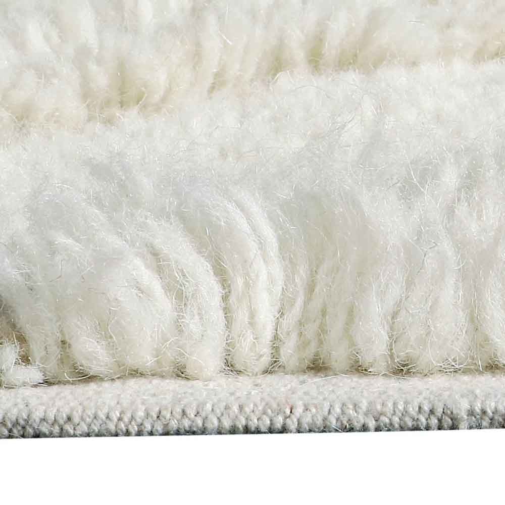 Tapis rectangulaire en laine avec une bordure irrégulière, réalisé avec des zones contrastées de hauteur de poils courte et moyenne, créant un motif subtil inspiré des clôtures en bois d'acacia des villages tribaux. À chaque coin, un galon fait main est attaché, facilement amovible au lavage.
