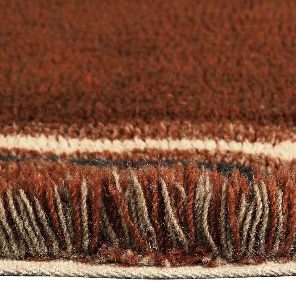 Ce tapis Woolable Karibu de forme ovale est inspiré de l'entrée des huttes Massaï. Le centre du tapis est composé de poils courts et entremêle des tons de terre cuite et de nuances oxyde. Sa bordure présente des signes tribaux, se terminant par une ligne de longs poils de couleurs contrastées.