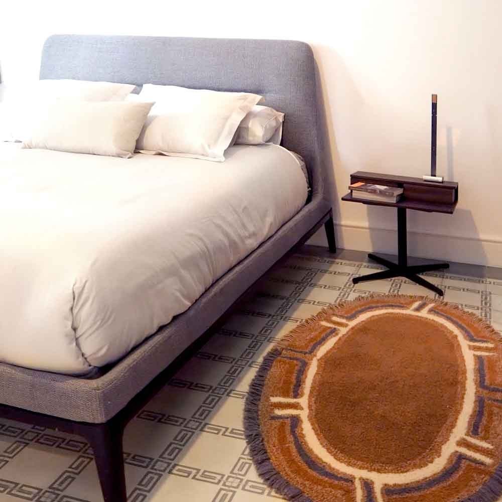 Ce tapis Woolable Karibu de forme ovale est inspiré de l'entrée des huttes Massaï. Le centre du tapis est composé de poils courts et entremêle des tons de terre cuite et de nuances oxyde. Sa bordure présente des signes tribaux, se terminant par une ligne de longs poils de couleurs contrastées.