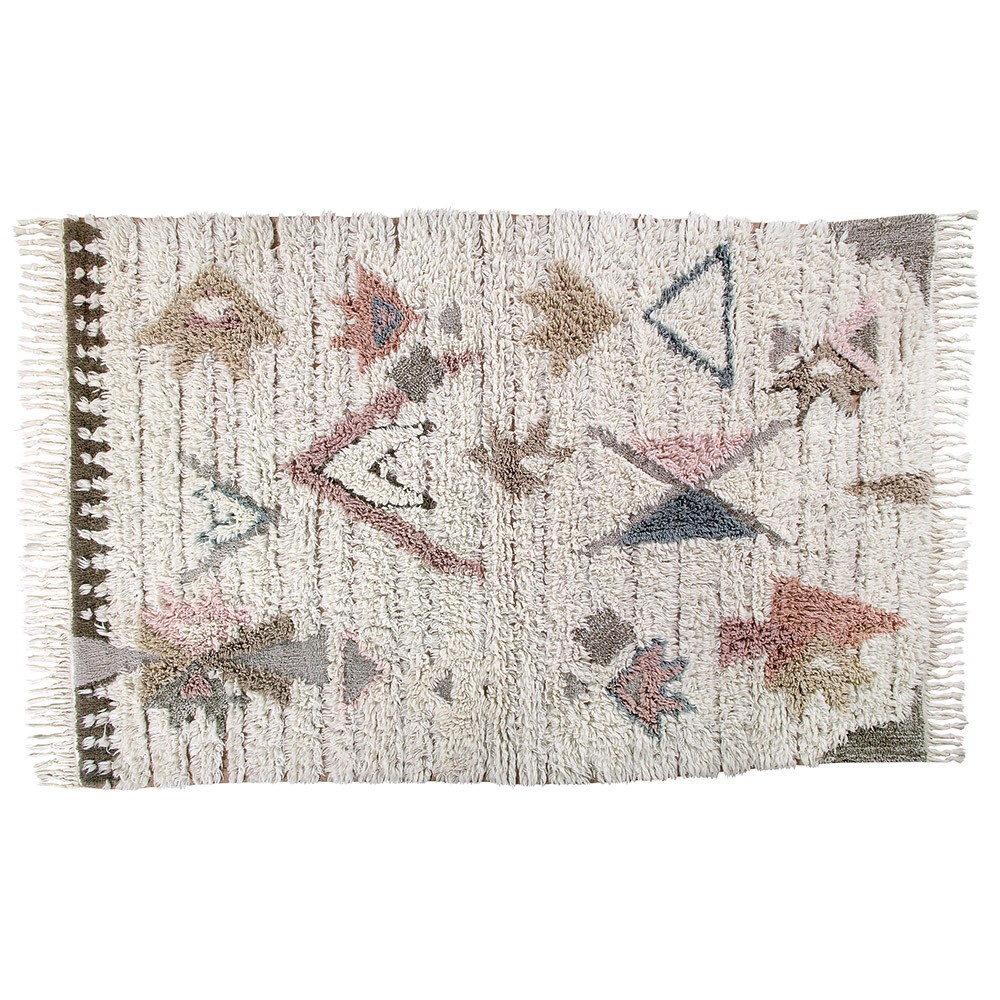 Ce tapis en laine Woolable Tuba, par Lorena Canals, aux motifs inspirés des symboles mystiques indiens et aux franges tressées à la main, apportera un esprit bohème à votre intérieur.