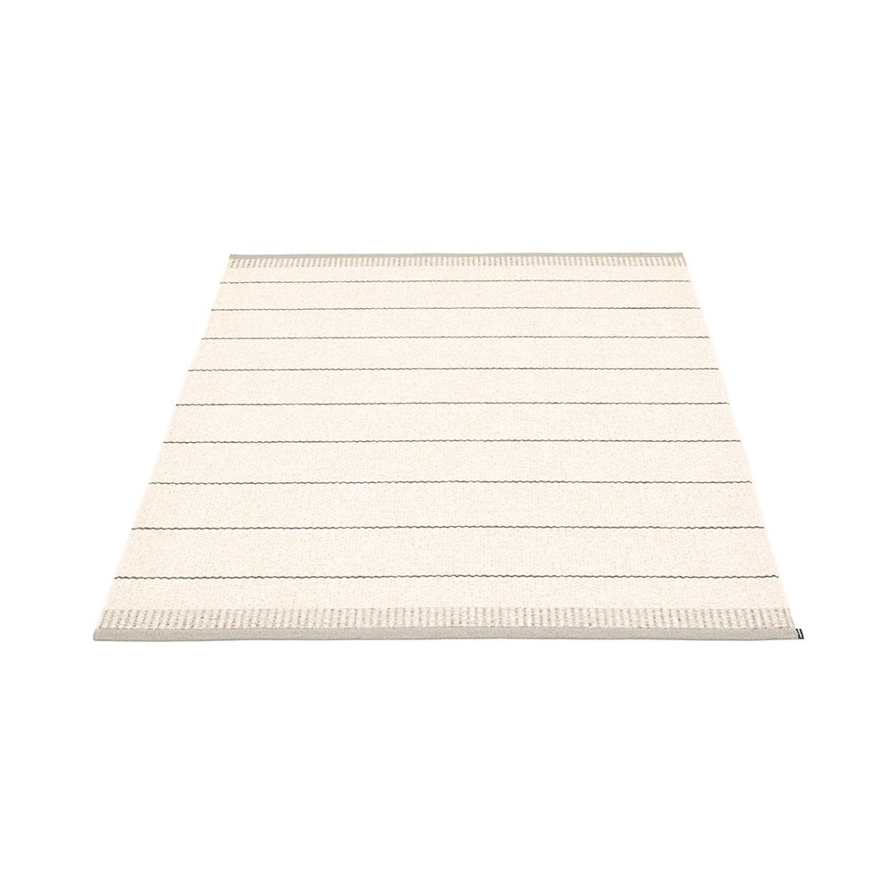 Produit à Dalarna, Suède. Tissé sur un métier à tisser traditionnel en utilisant des navettes en bois. Un tapis en PVC très pratique et facile d’entretien manufacturé en Suède. Rubans de plastique pressés pour une plus grande solidité et durabilité du produit avec le logo Pappelina pressé sur les deux bords.
