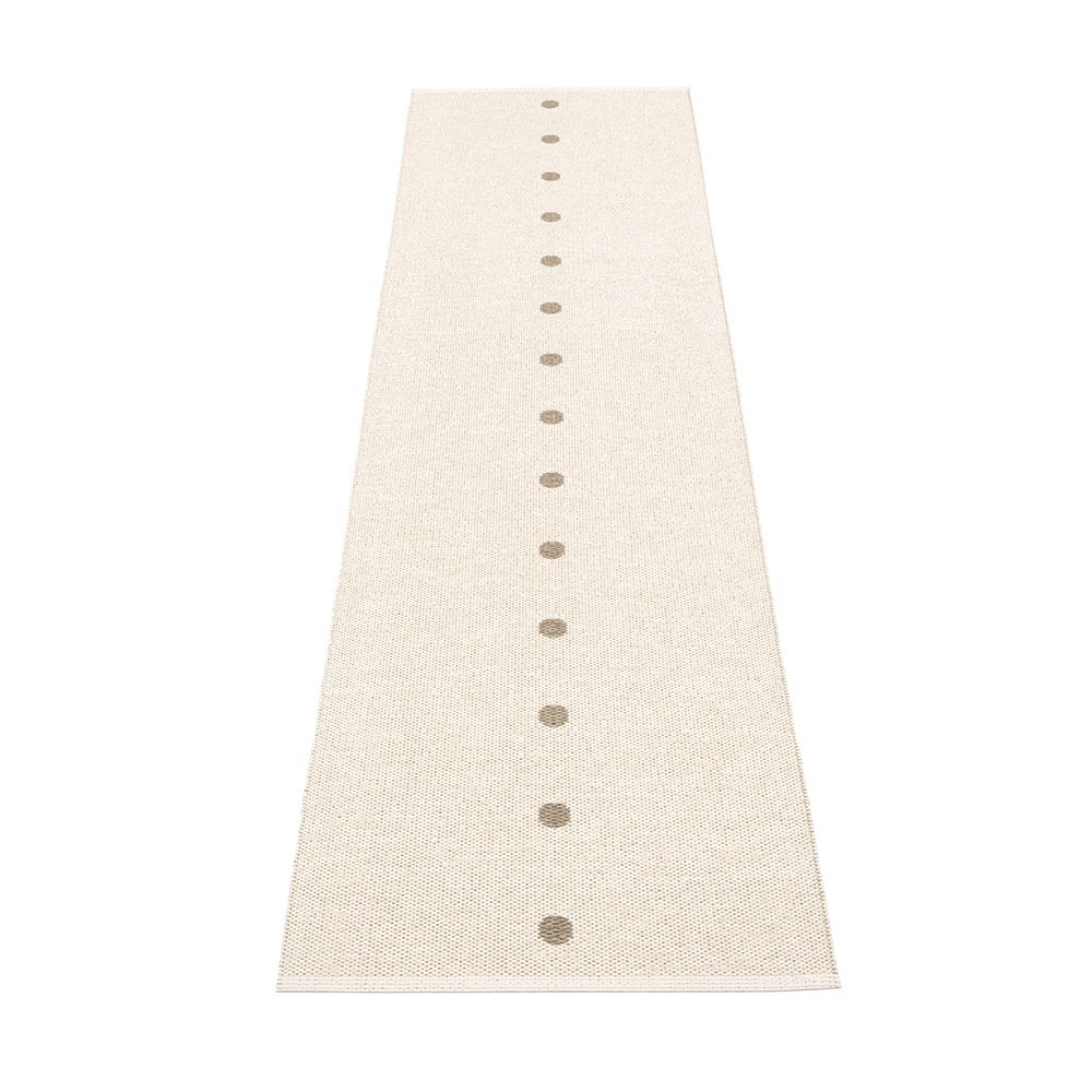Produit à Dalarna, Suède. Tissé sur un métier à tisser traditionnel en utilisant des navettes en bois. Un tapis en PVC très pratique et facile d’entretien manufacturé en Suède. Rubans de plastique pressés pour une plus grande solidité et durabilité du produit avec le logo Pappelina pressé sur les deux bords.