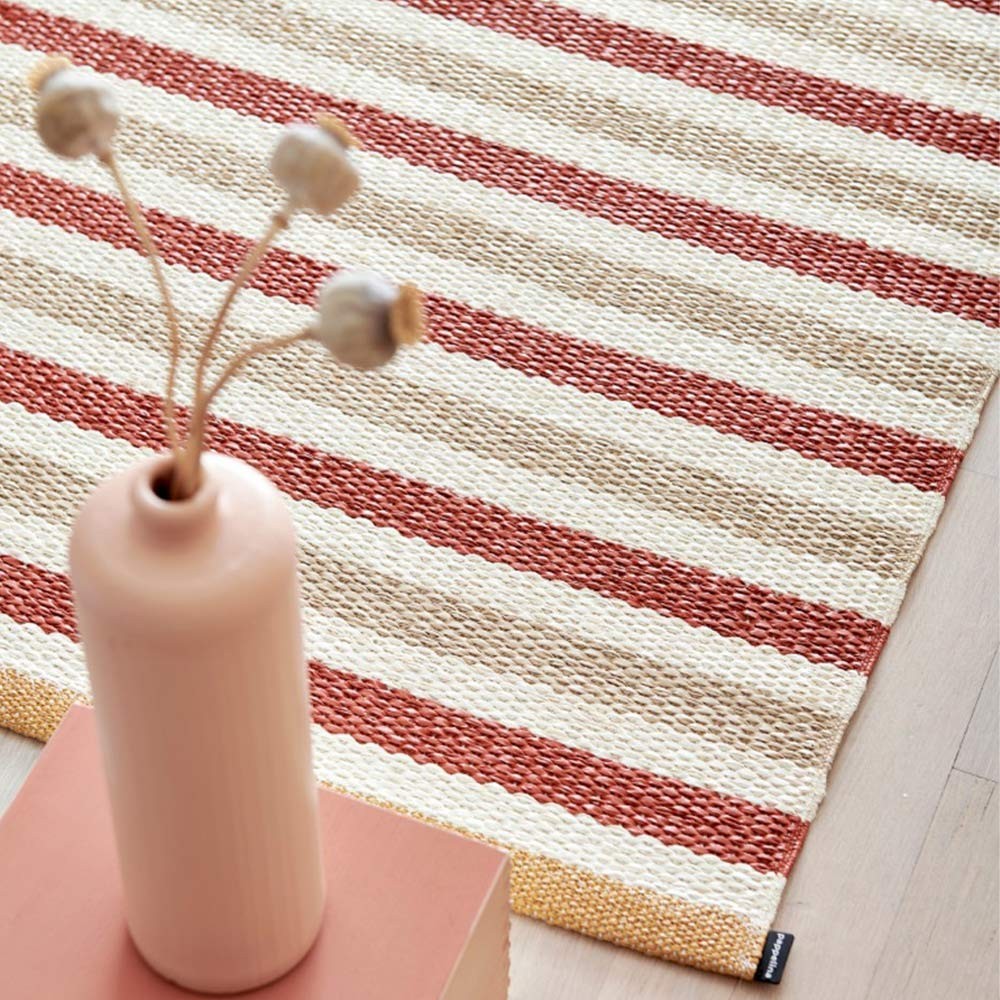 Produit en suède, le tapis TEO est en plastique pour une utilisation intérieure et extérieure. Ses bords sont ourlés avec un logo cousu sur une extrémité. Le tapis est tissé de bandelettes en plastique sans phtalate par Gislaved Folie AB sur un métier à tisser traditionnel. Il est disponible en plusieurs coloris et en plusieurs dimensions.