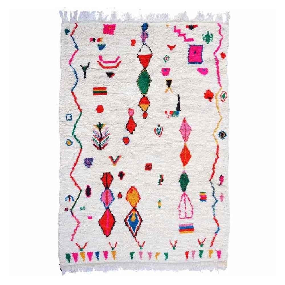 Ce tapis que l’on appelle Azilal tient son nom de la région d’Azilal dans les montagnes de l’Atlas au Maroc où il a été confectionné. Chaque pièce est confectionnée de façon 100% artisanale sur un métier à tisser traditionnel. Plus de deux mois de tissage sont nécessaires pour confectionner un tapis de taille moyenne.
