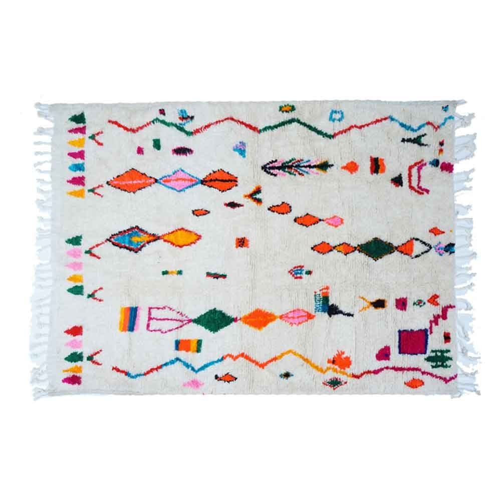 Ce tapis que l’on appelle Azilal tient son nom de la région d’Azilal dans les montagnes de l’Atlas au Maroc où il a été confectionné. Chaque pièce est confectionnée de façon 100% artisanale sur un métier à tisser traditionnel. Plus de deux mois de tissage sont nécessaires pour confectionner un tapis de taille moyenne.