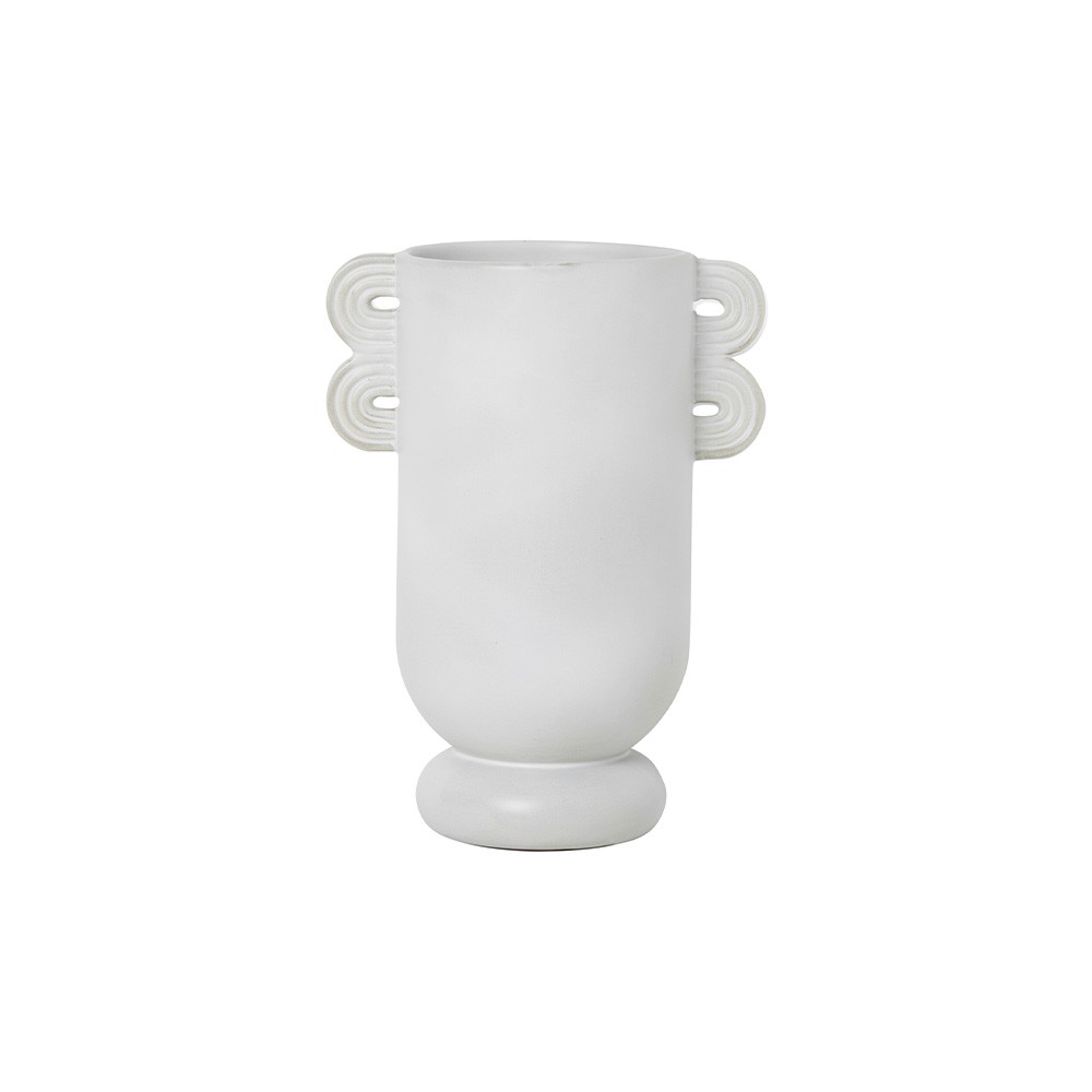 Ce joli petit vase Ania, par Ferm Living, appartient à l'élégante collection de vases Muses de la marque. Ces derniers sont fabriqués en céramique émaillée et ressemblent plus ou moins à des objets de notre quotidien. Ici, le vase Ania s'inspire du design d'un trophée, avec une petite base plate en bas puis avec une structure formant une coupe sur le dessus, s'ajoute à cela deux petites poignées décoratives. Avec son allure aussi moderne qu'épurée, ce vase trouvera parfaitement sa place dans votre maison. Dans le salon, l'entrée ou un bureau, sur une table ou sur le sol, les possibilités sont infinies pour faire de ce vase une pièce maîtresse de votre maison.