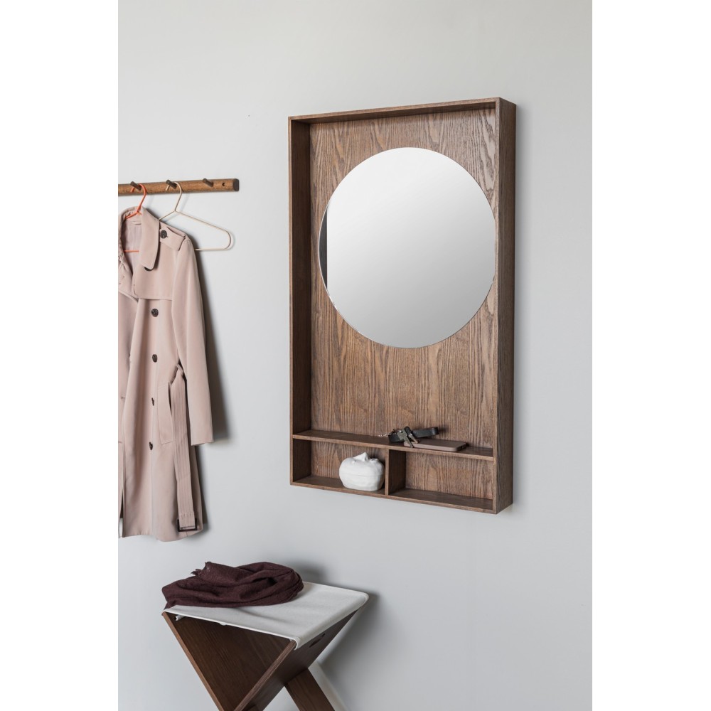 Un pezzo funzionale con sottili riferimenti agli anni '70. La mensola a specchio SHOW-ME combina uno specchio circolare con sottili ripiani in impiallacciatura di rovere oliato scuro. Con spazio per chiavi, profumi o oggetti decorativi, è perfetta per l'ingresso, la camera da letto o lo spogliatoio.