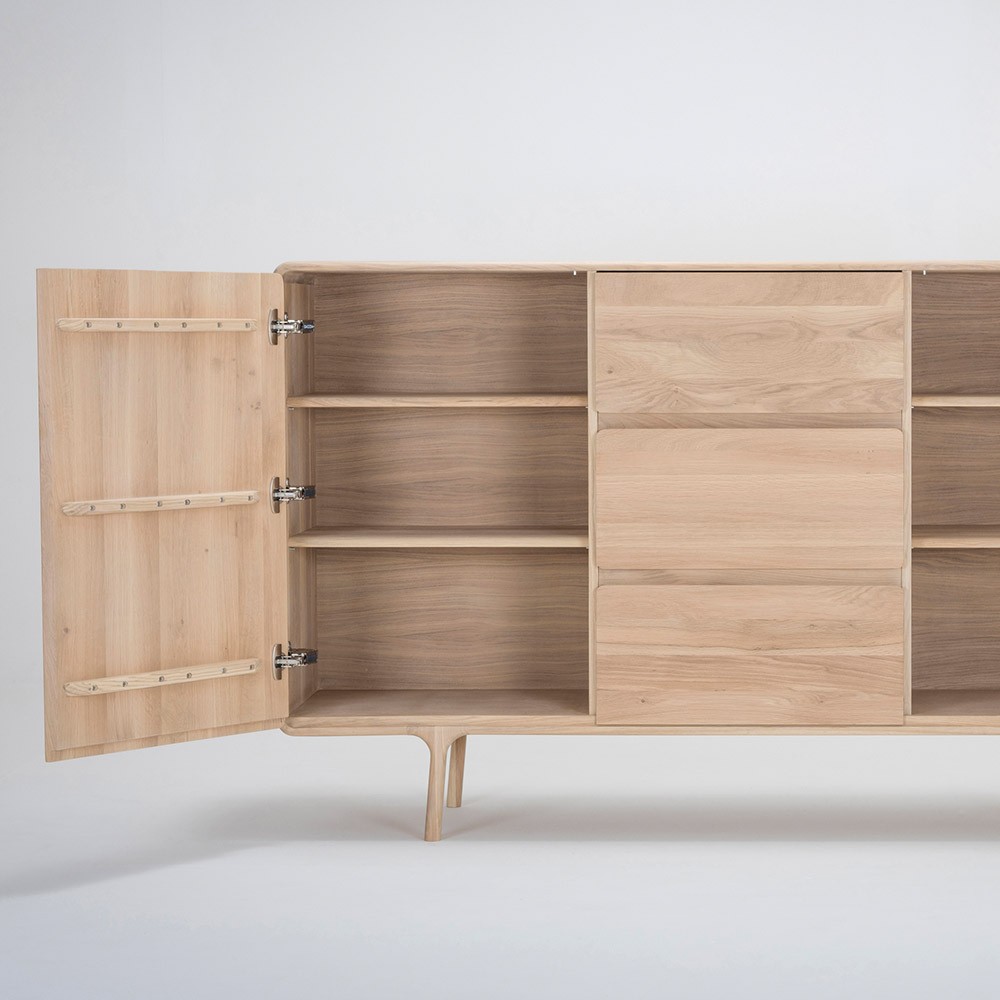Stai cercando spazio di archiviazione aggiuntivo nel tuo soggiorno, sala da pranzo o camera da letto? Perché non innamorarsi della gamma di contenitori Fawn di Gazzda con questa sontuosa cassettiera in rovere. Con i suoi 2 armadi e 3 cassetti, avrai abbastanza per riporre piatti o vestiti. Non solo, il suo sistema di smorzamento alla chiusura di ante e cassetti renderà la tua vita quotidiana molto più piacevole!