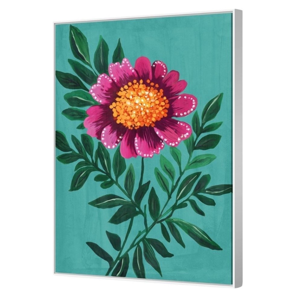 Valorizzate l'arredamento della vostra casa con la tela incorniciata "Épanouissement" di Athezza. Questo pezzo artistico presenta un vivace motivo floreale: un grande fiore con petali fucsia e un cuore giallo-arancio, circondato da un fogliame verde, il tutto su uno sfondo turchese intenso. La stampa su tessuto di velluto aggiunge una profondità e una morbidezza incomparabili, mentre la cornice sottile esalta la composizione e le conferisce un tocco contemporaneo.