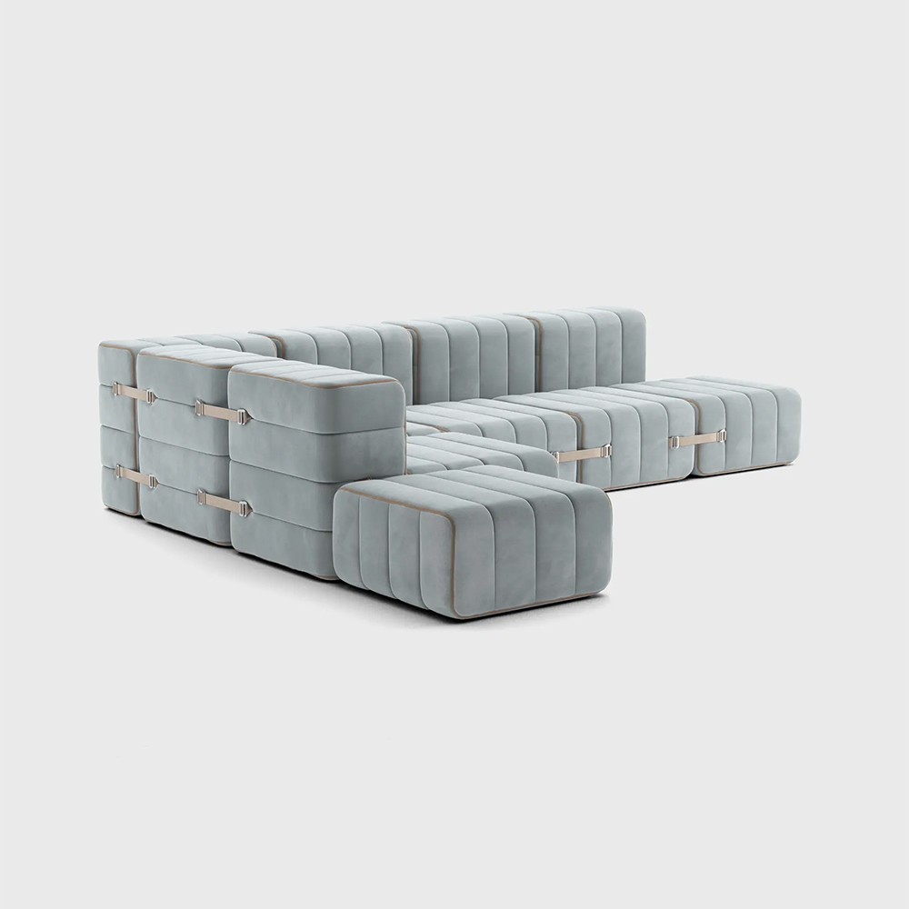 Il set Curt 12 moduli può stare in piedi da solo e diventare una poltrona asimmetrica, panca, chaise longue o piccoli sgabelli individuali. Bastano pochi moduli singoli per trasformarsi in un sistema divano estremamente flessibile e modulare e questo in modo molto semplice: il set di 12 moduli Curt è costituito da cinghie regolabili che consentono di creare all'infinito.