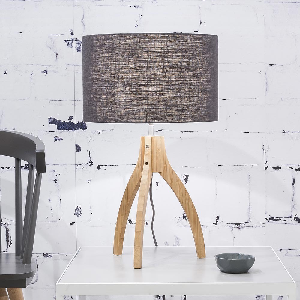 La lampada da tavolo Annapurna in lino grigio scuro, disegnata da Good & Mojo, diffonde una luce morbida grazie al suo paralume in lino. Si adatta facilmente a qualsiasi stanza della casa mentre invita la natura all'interno con la sua struttura in legno di bambù.