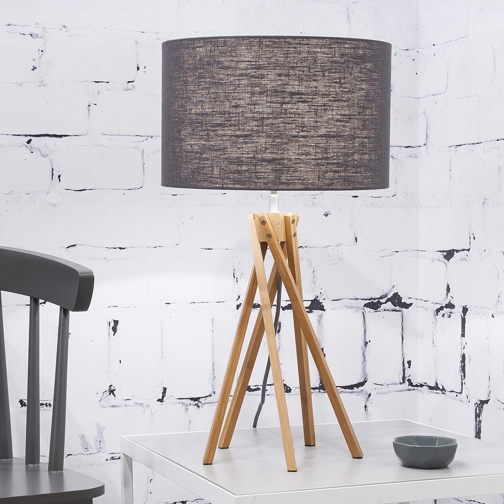 La lampada da tavolo Kilimanjaro in lino grigio scuro, disegnata da Good & Mojo, diffonde una luce morbida grazie al suo paralume in lino. Si adatta facilmente a qualsiasi stanza della casa mentre invita la natura all'interno con la sua struttura in legno di bambù.