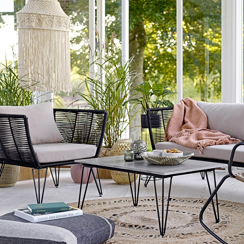 Questa collezione di mobili da esterno firmata Bloomingville porterà un tocco retrò e originale alla tua terrazza. Composta da fili di PVC intrecciati su un sottile telaio in metallo laccato, la corda è resistente alle intemperie e ai raggi UV. I cuscini sono comodi e sono rivestiti in tessuto di poliestere impermeabile che ne consente l'uso sia all'interno che all'esterno.